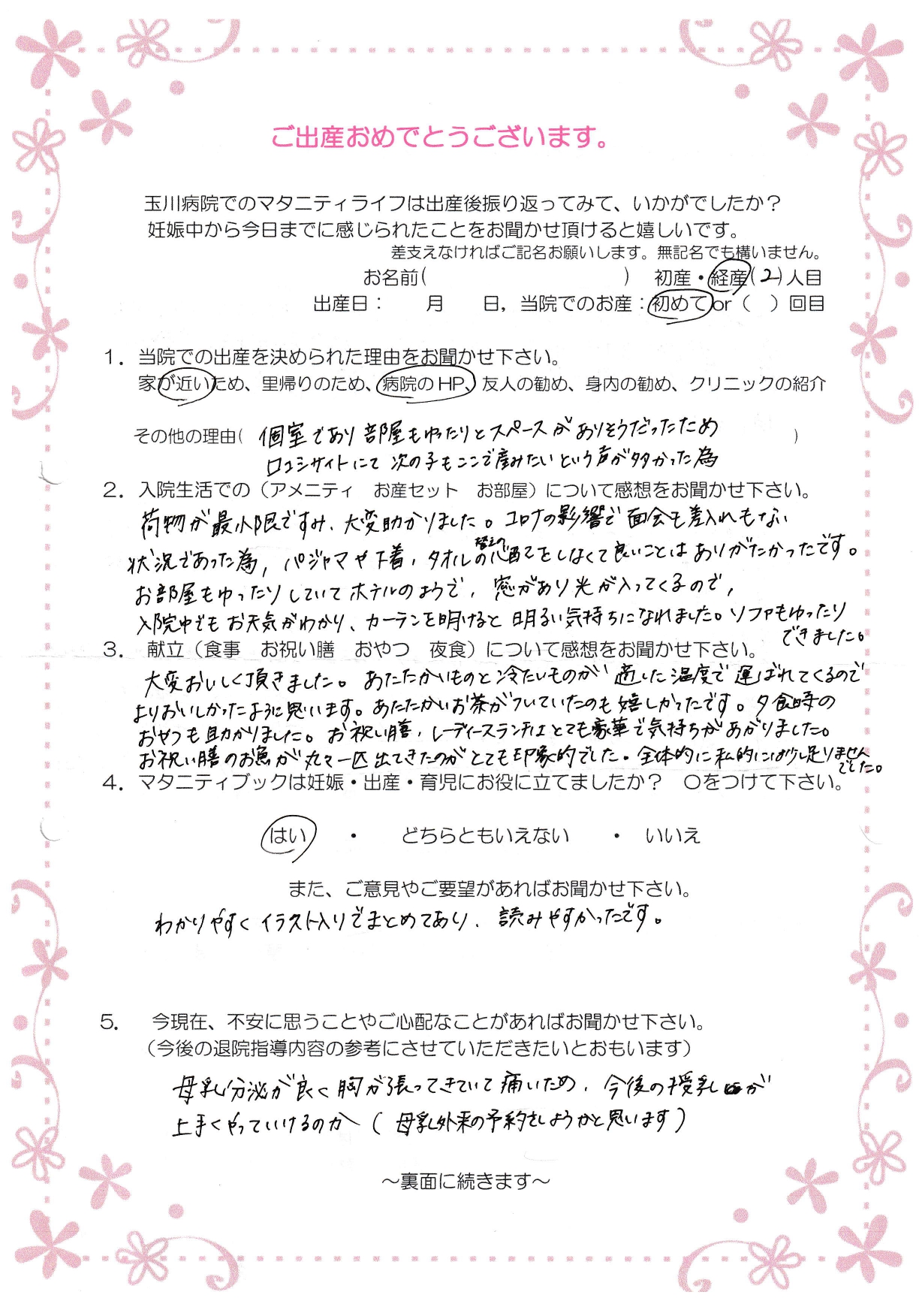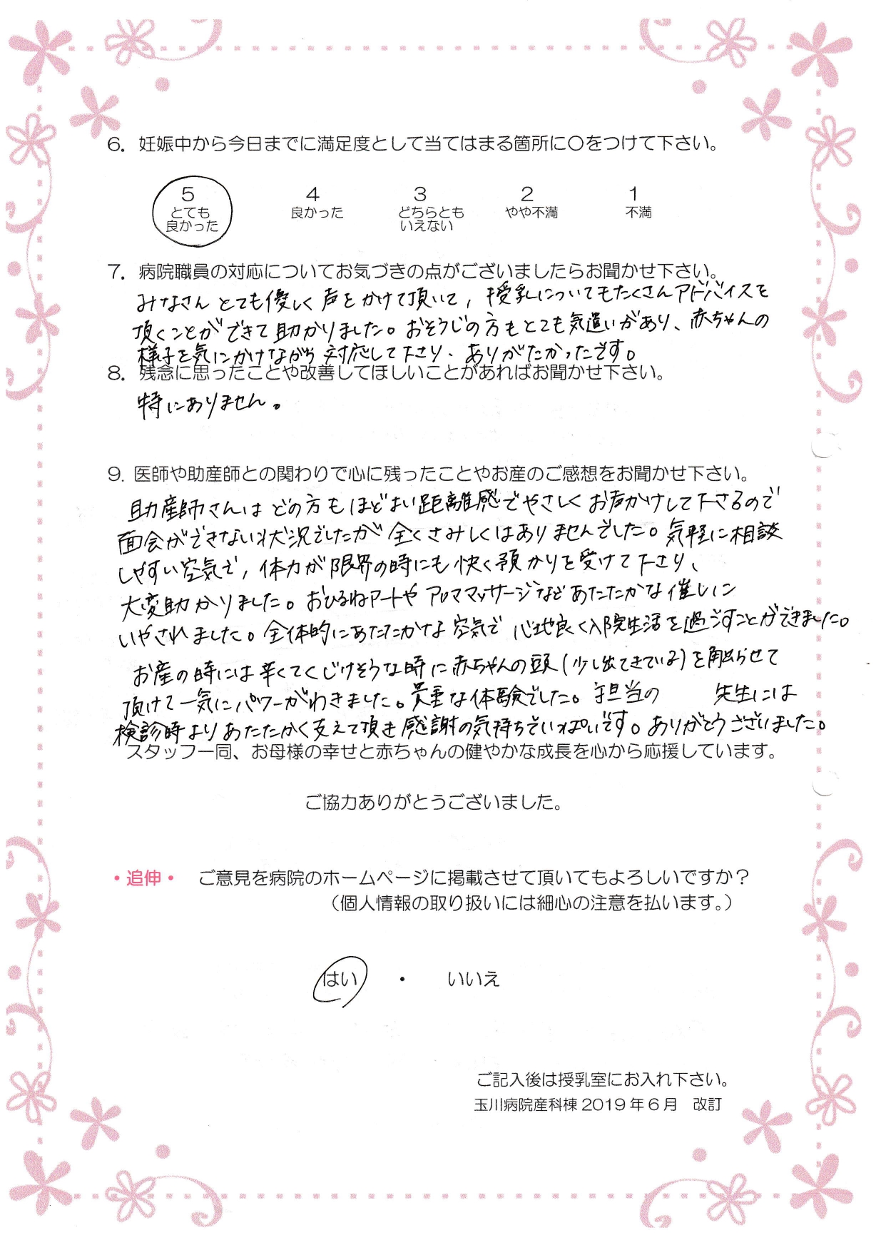 【9】 助産師さんはどの方もほどよい距離感でやさしくお声かけして下さるので面会ができない状況でしたが全くさみしくはありませんでした。気軽に相談しやすい空気で、体力が限界の時にも快く預かりを受けて下さり、大変助かりました。おひるねアートやアロママッサージなどあたたかな催しにいやされました。全体的にあたたか空気で心地良く入院生活を過ごすことができました。お産の時には辛くてくじけそうな時に赤ちゃんの頭(少し出てきている)を触らせて頂けて一気にパワーがわきました。貴重な体験でした。担当の○○先生には検診時よりあたたかく支えて頂き感謝の気持ちでいっぱいです。ありがとうございました。