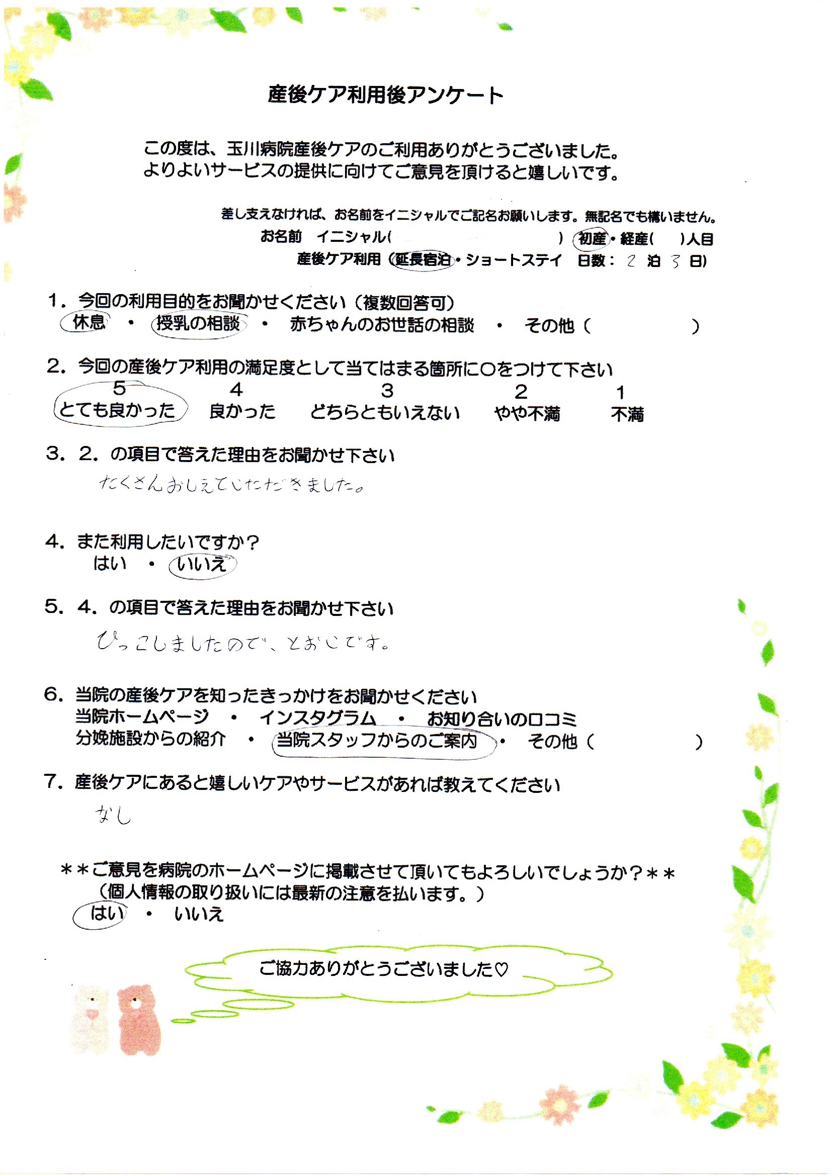 産後ケアママさん100 2025.09.26 【1】休息・授乳の相談 【2】5 とても良かった 【3】たくさんおしえていただきました。 【4】いいえ 【5】ひっこしましたので、とおいです。 【6】当院スタッフからのご案内 【7】なし 産後ケアママさん99前の記事 先輩ママさん687次の記事
