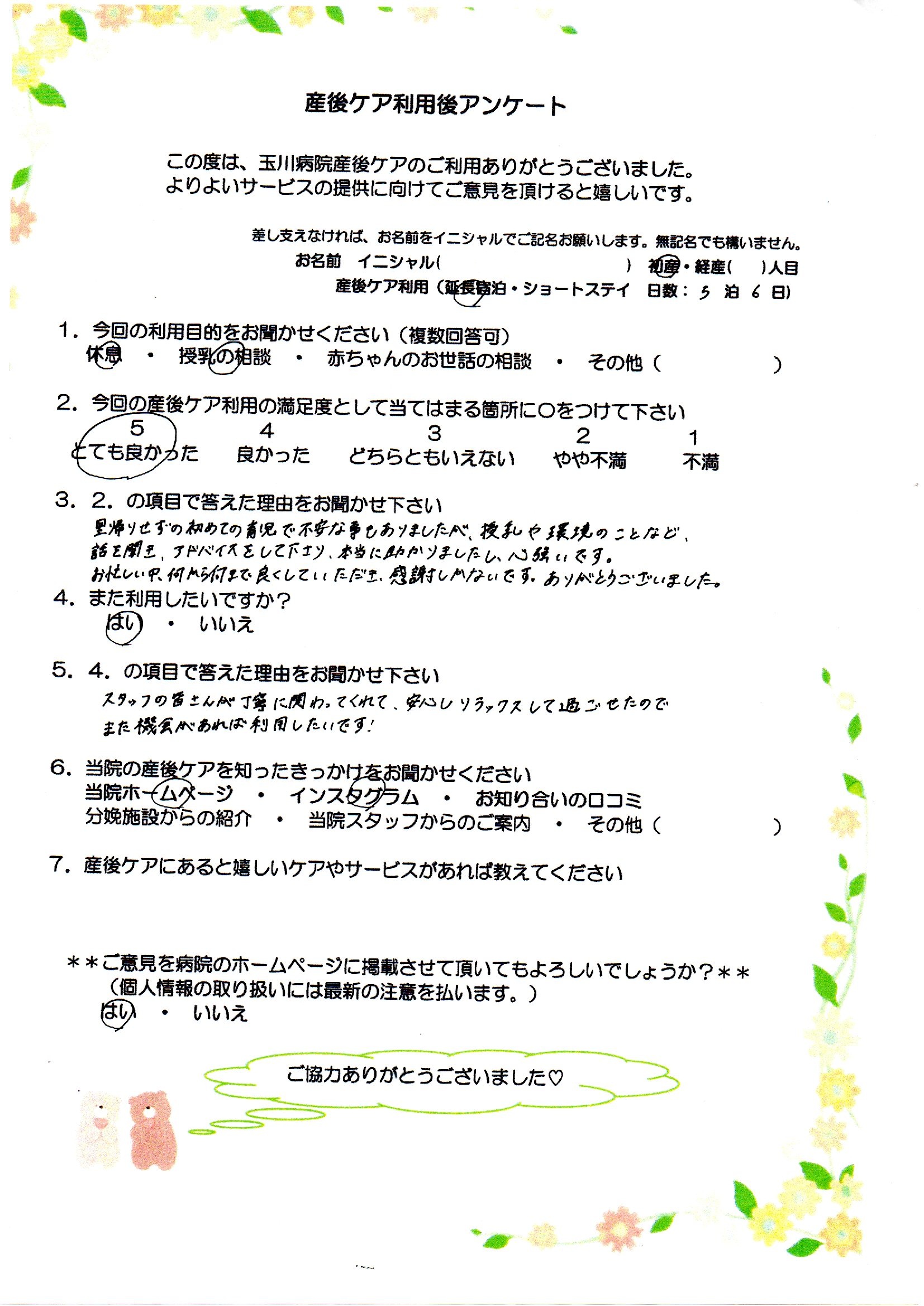 【5】スタッフの皆さんが丁寧に関わってくれて、安心しリラックスして過ごせたのでまた機会があれば利用したいです!