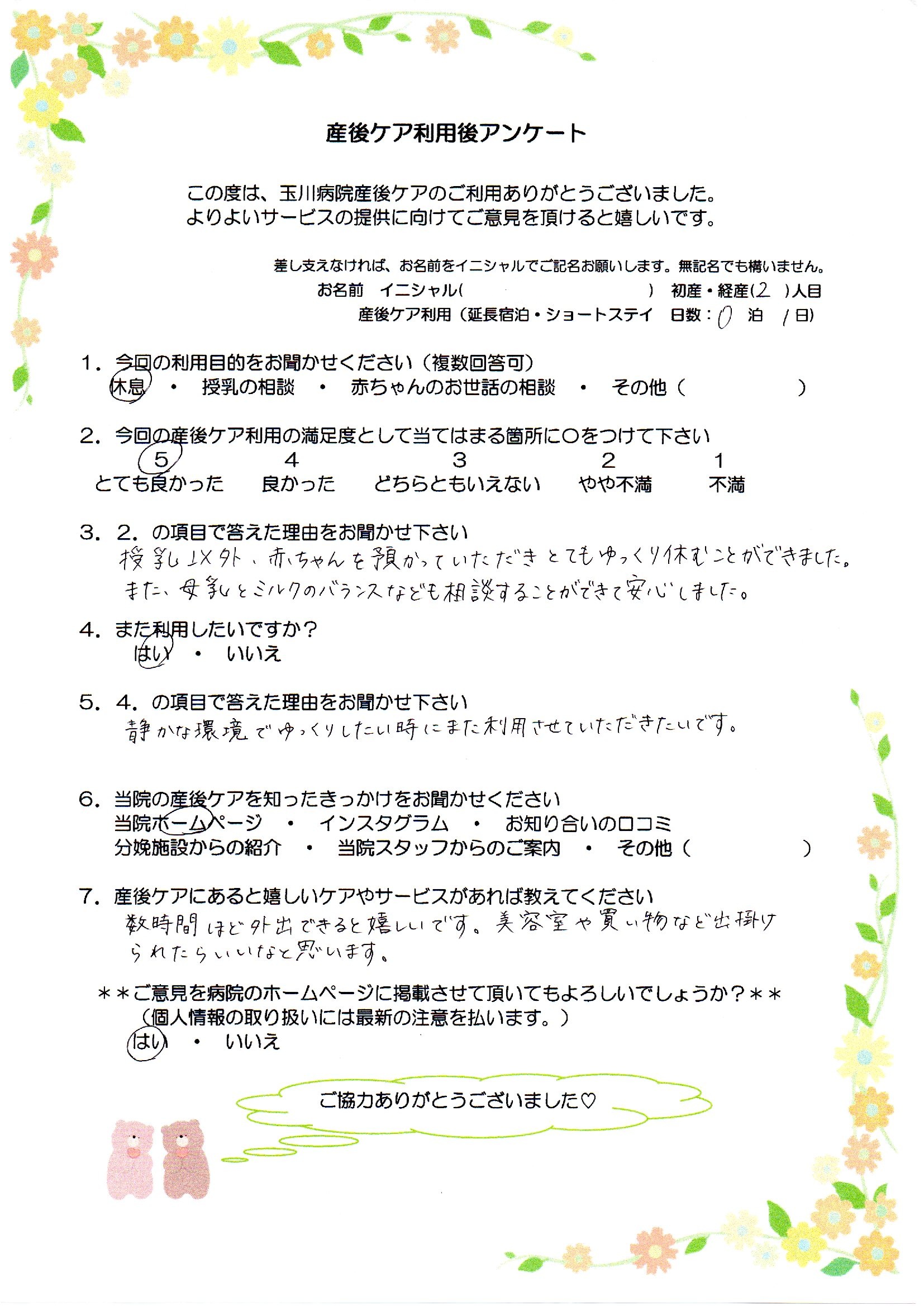 【3】授乳以外、赤ちゃんを預かっていただきとてもゆっくり休むことができました。また、母乳とミルクのバランスなども相談することができて安心しました。