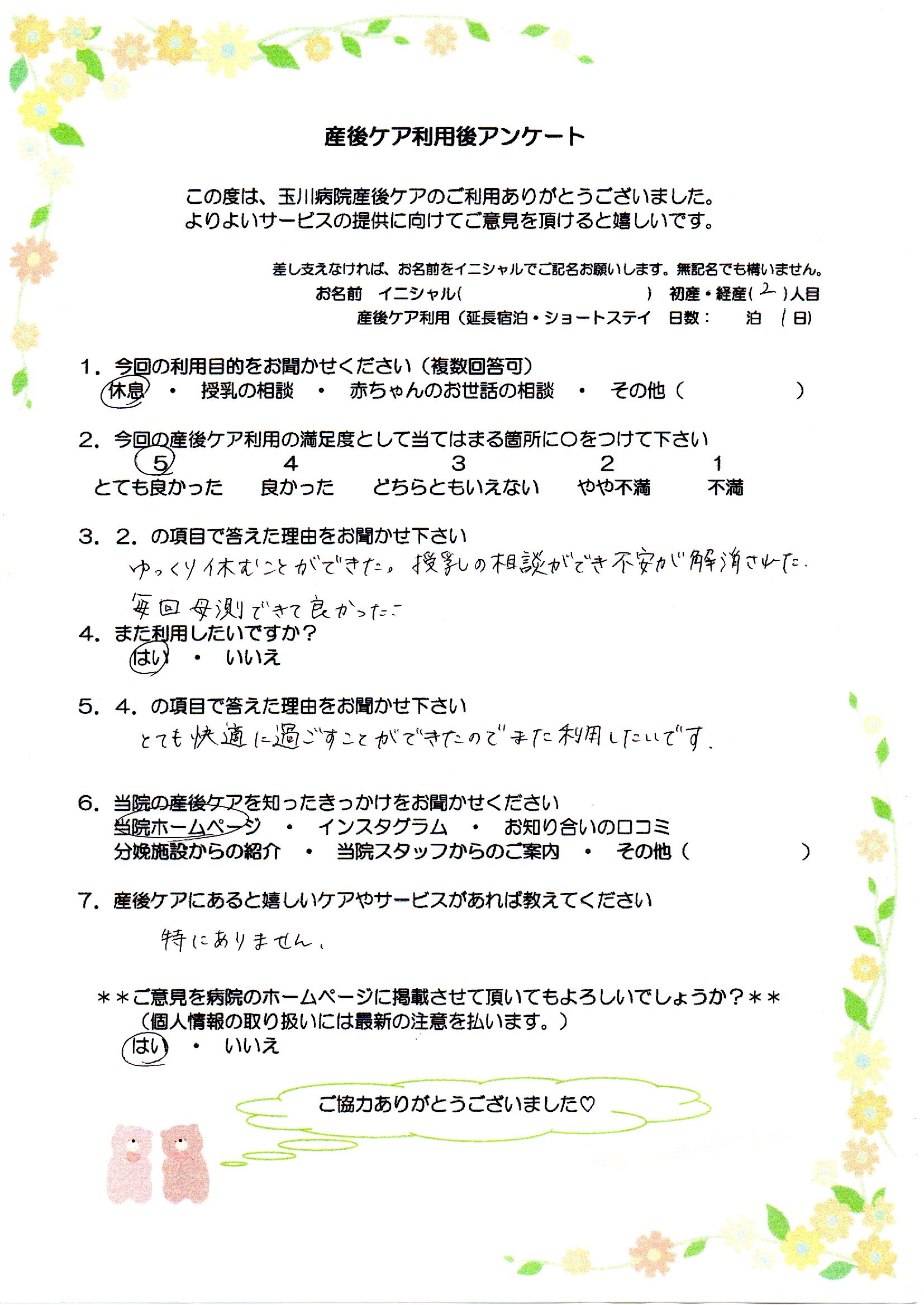 ゆっくり休むことができた。授乳の相談ができ不安が解消された。毎回母測できて良かった。