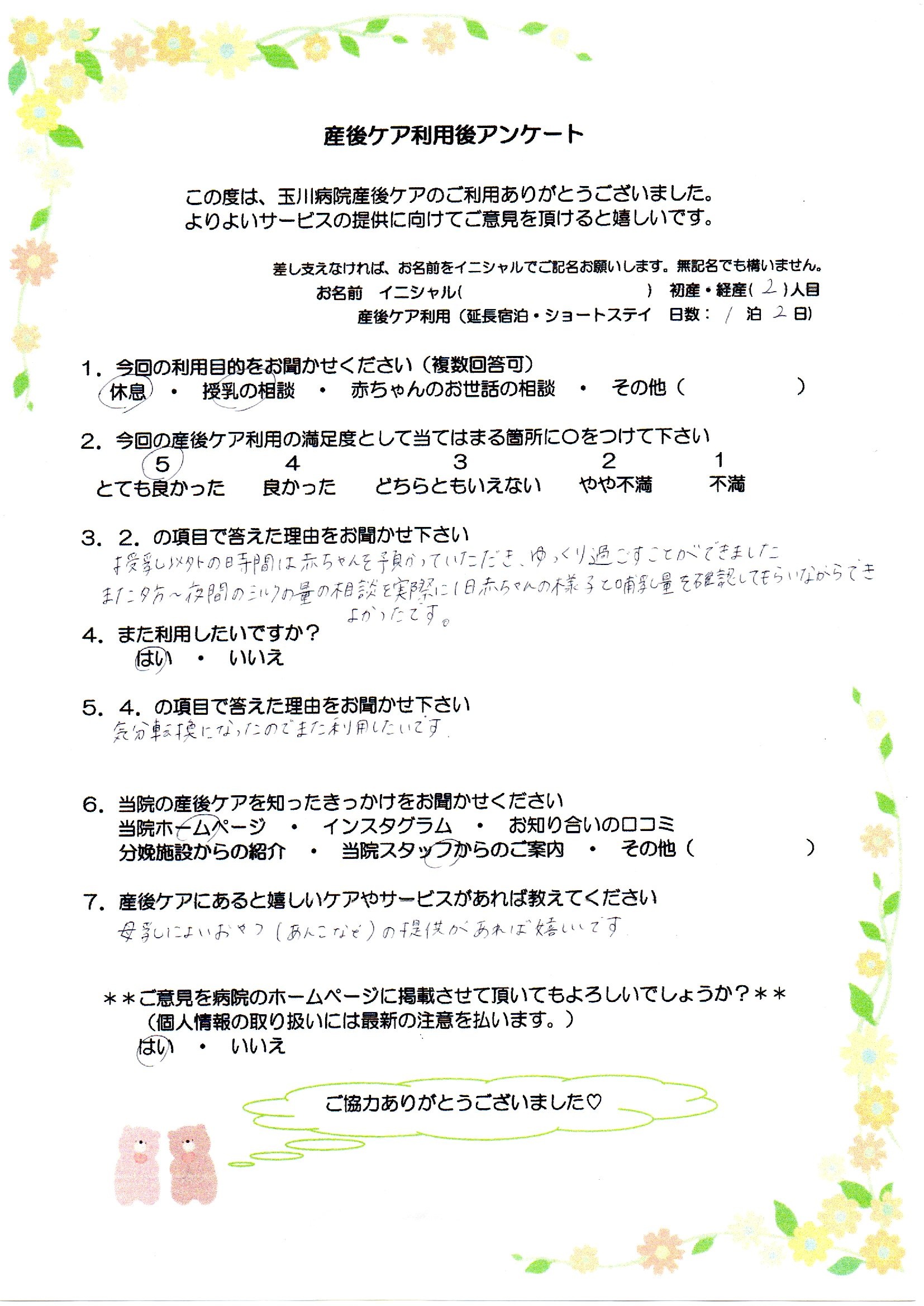 授乳以外の時間は赤ちゃんを預かっていただき、ゆっくり過ごすことができました また夕方~夜間のミルクの量の相談を実際に1日赤ちゃんの様子と哺乳量を確認してもらいながらできよかったです。