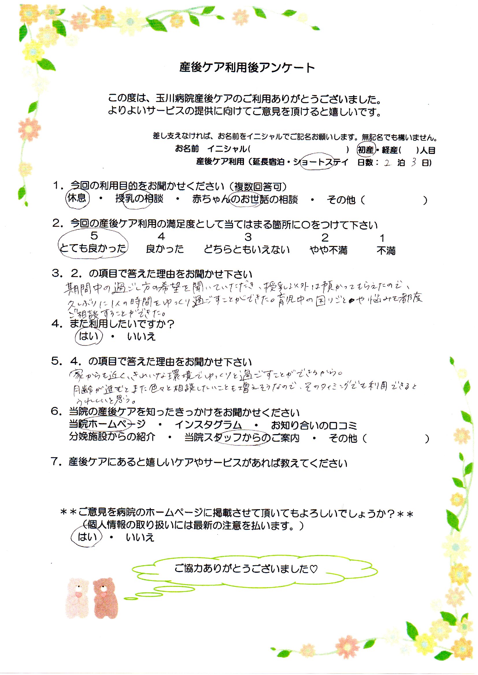 【3】期間中の過ごし方の希望を聞いていただき、授乳以外は預かってもらえたので、久しぶりに1人の時間をゆっくり過ごすことができた。育児中の困りごとや悩みも都度ご相談することができた。