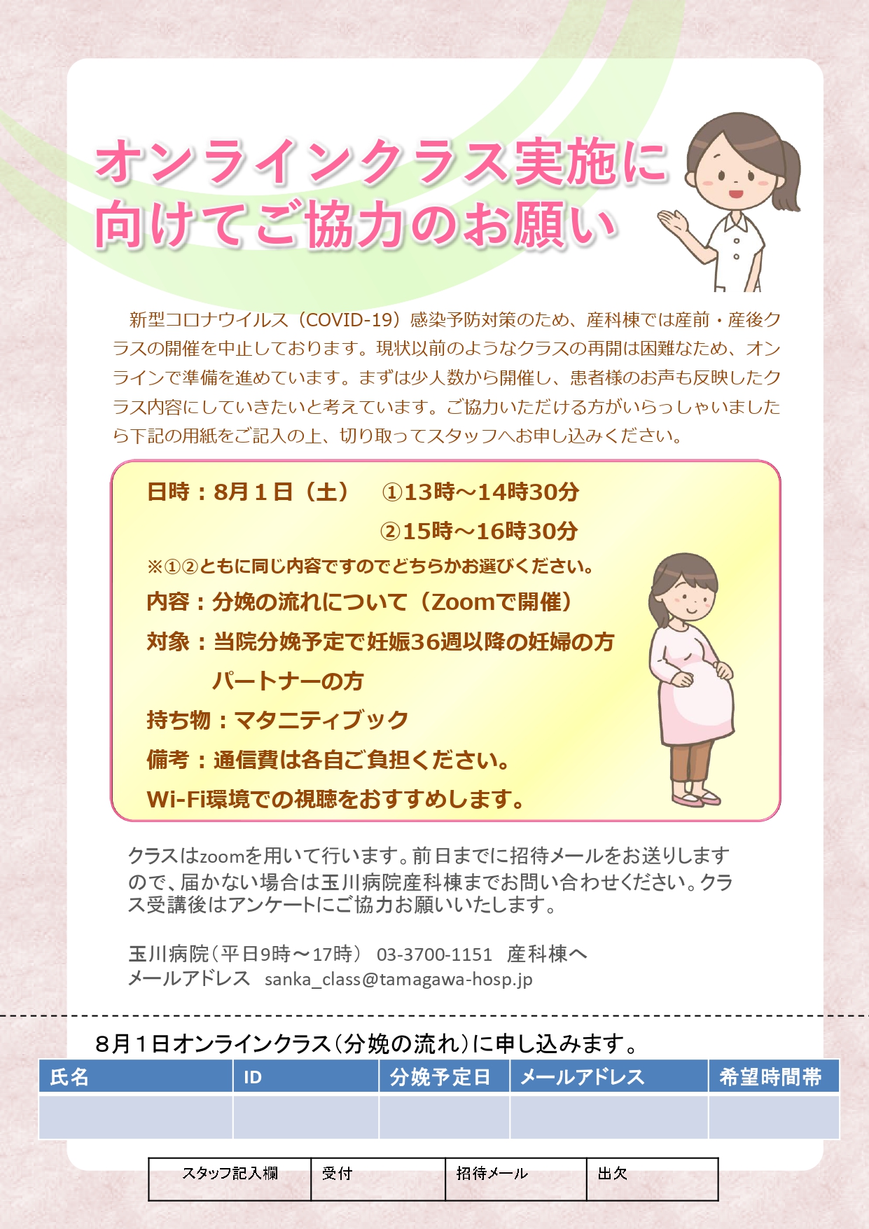 オンラインクラスを開始します! 2020.07.20 お待たせしました。玉川病院産科でもオンラインクラスを開始します。内容は分娩の流れについてです。 詳細は下記をご覧ください。 おひるねアートが日産厚生会会報に紹介されました前の記事 ママと赤ちゃんの退院時に、パパへの育児指導を行っています次の記事