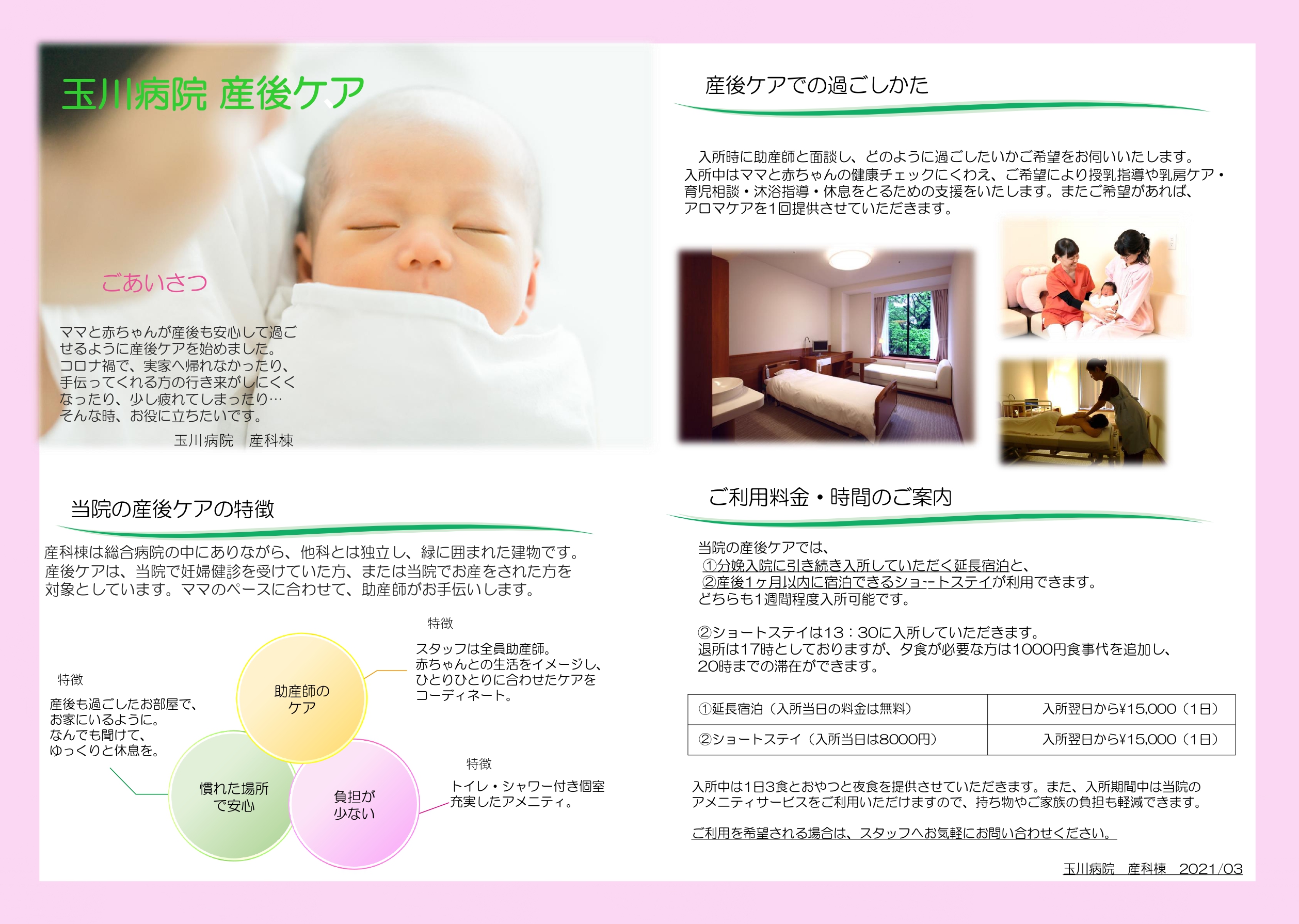 産後ケアを始めました 2021.03.13 玉川病院産科棟で産後ケアを始めました。お産の入院に引き続き、産後ケアを利用することができます。ご希望の方は助産師にお申し出ください。 お知らせをダウンロードしたい方は下記からどうぞ 産後ケア 沐浴オンラインクラスをプレ実施します!前の記事 当院での分娩を控えている妊婦さん及びご家族の方へ次の記事