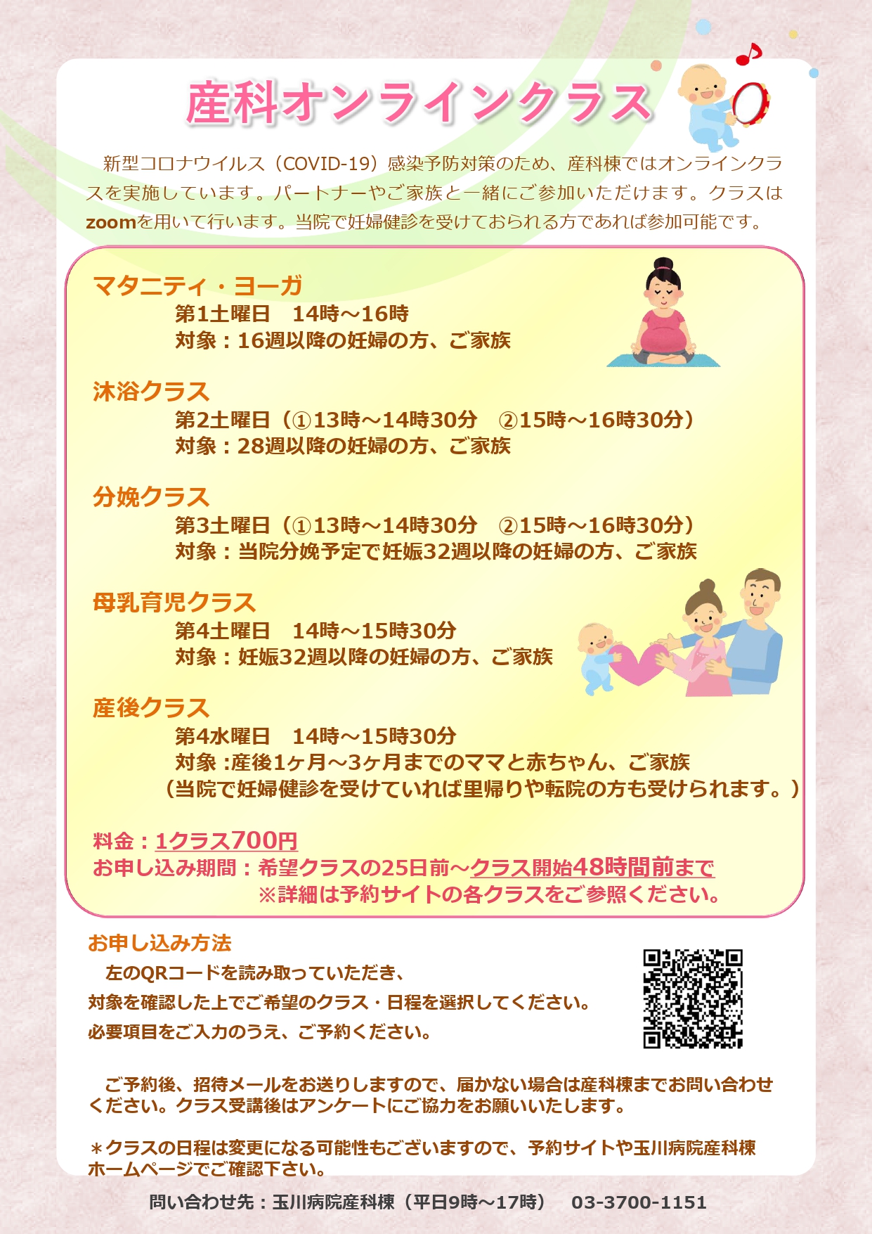 産科オンラインクラスのお知らせ 2021.02.28 産科オンラインクラスの予約は、今後STORESのシステムから申し込めるようになりました。 4月からは各クラス700円で受講できます。ぜひご参加ください。 クラスの詳細は下記の予約ボタンか、ちらしのQRコードからご確認ください。 妊婦さん及び授乳婦さんへの新型コロナウイルスワクチン接種について前の記事 沐浴オンラインクラスをプレ実施します!次の記事