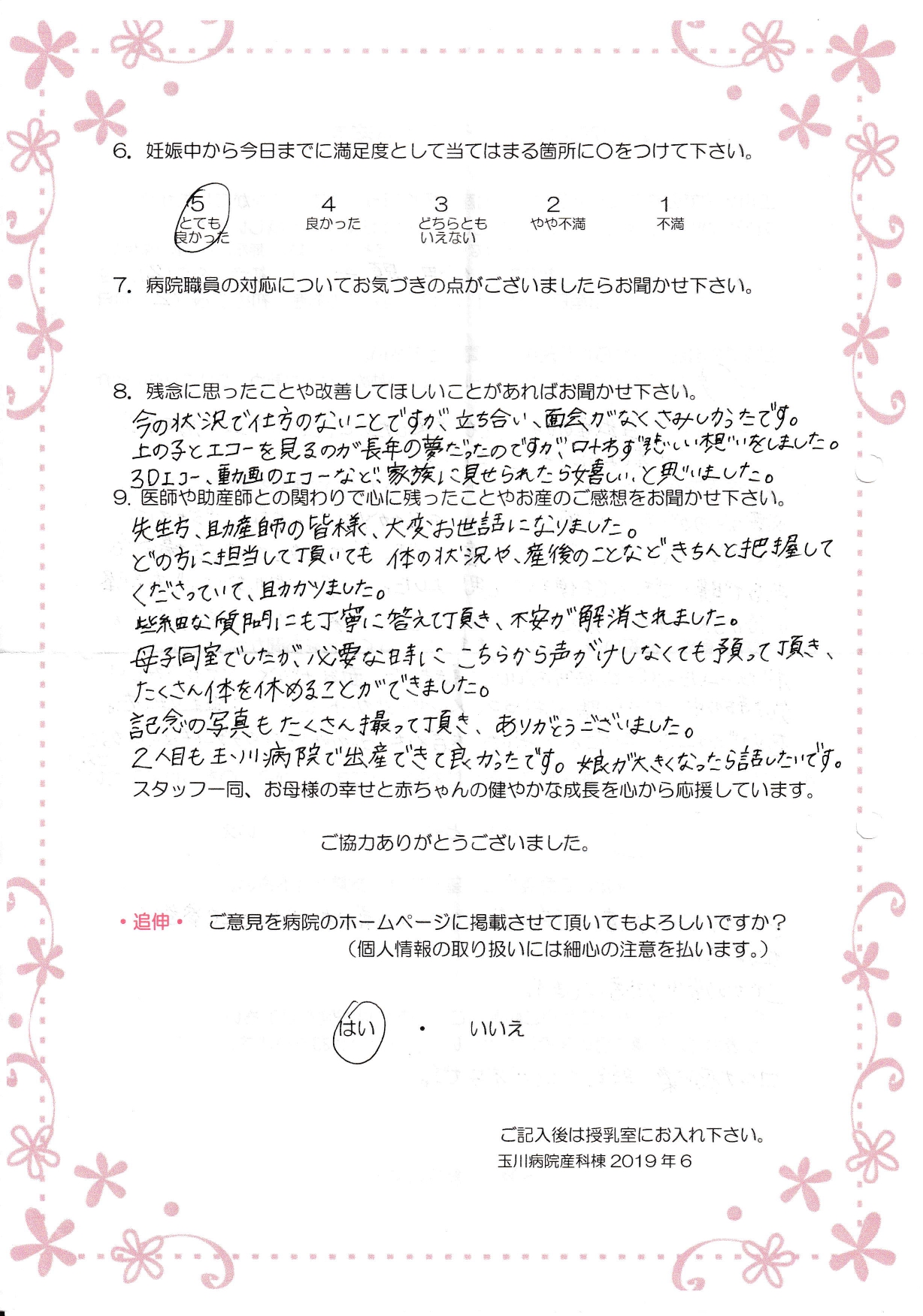 【9】先生方、助産師の皆様、大変お世話になりました。どの方に担当して頂いても体の状況や、産後のことなどきちんと把握してくださっていて、助かりました。些細な質問にも丁寧に答えて頂き、不安が解消されました。母子同室でしたが、必要な時にこちらから声がけしなくても預って頂き、たくさん体を休めることができました。記念の写真もたくさん撮って頂き、ありがとうごあいました。2人目も玉川病院で出産できて良かったです。娘が大きくなったら話したいです。