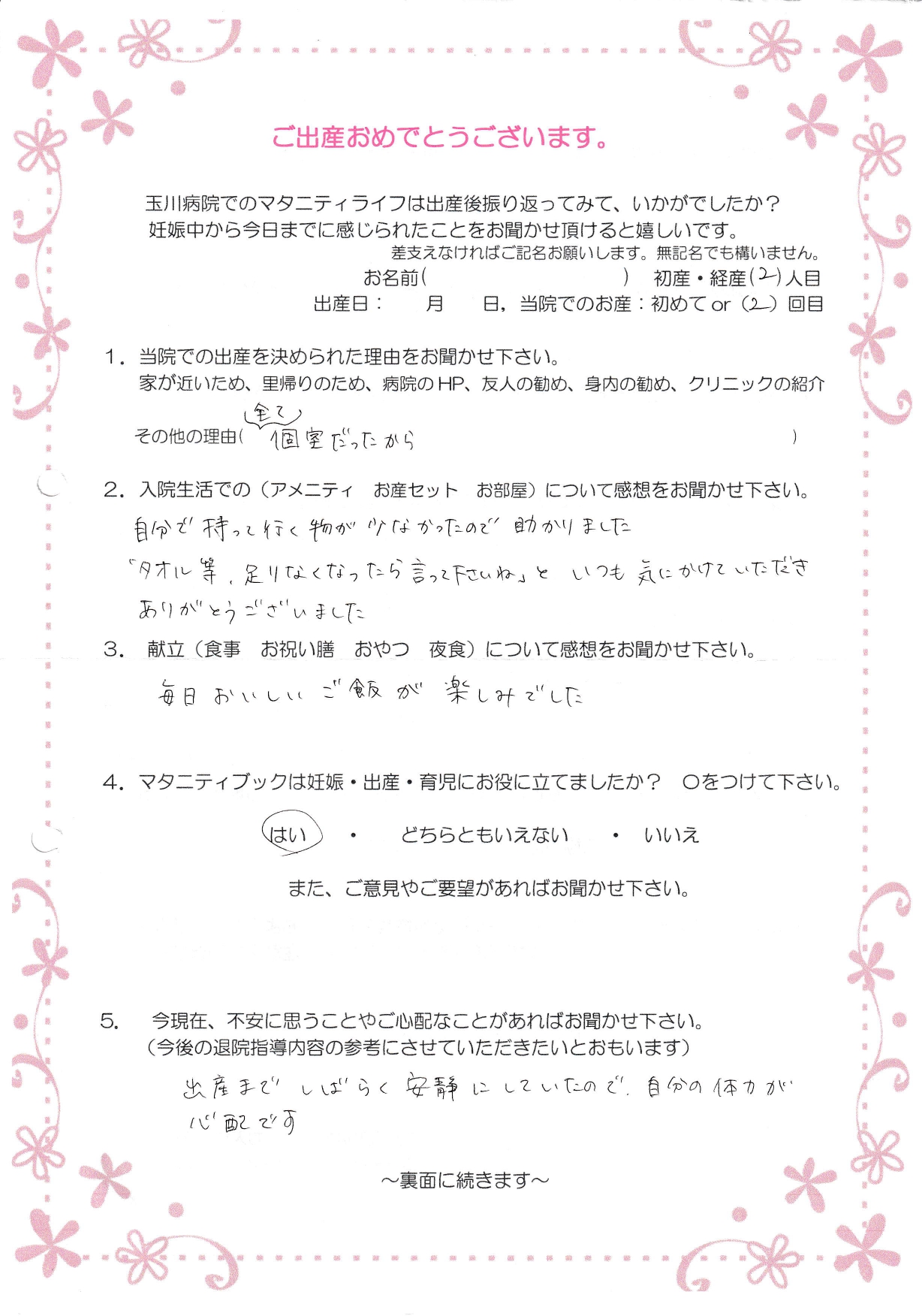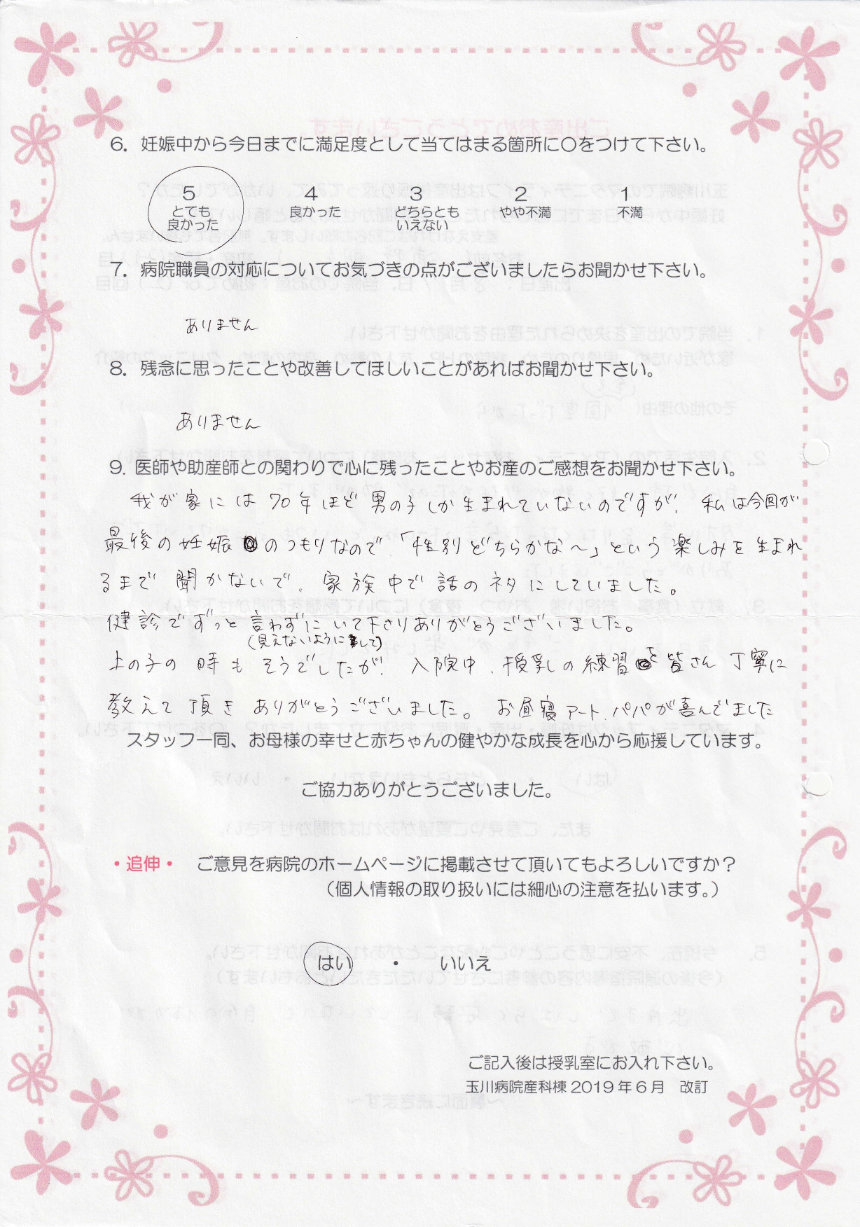 【9】我が家には70年ほど男の子しか生まれていないのですが、私は今回が最後の妊娠のつもりなので「性別どちらかな~」という楽しみを生まれるまで聞かないで、家族中で話のネタにしていました。健診でずっと言わずにいて(見えないようにして)下さりありがとうございました。上の子の時もそうでしたが、入院中、授乳の練習を皆さん丁寧に教えて頂きありがとうございました。お昼寝アート、パパが喜んでました。