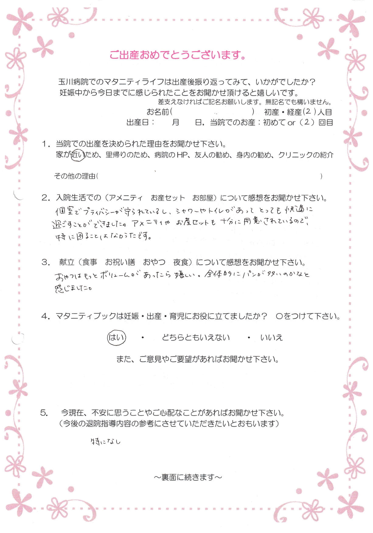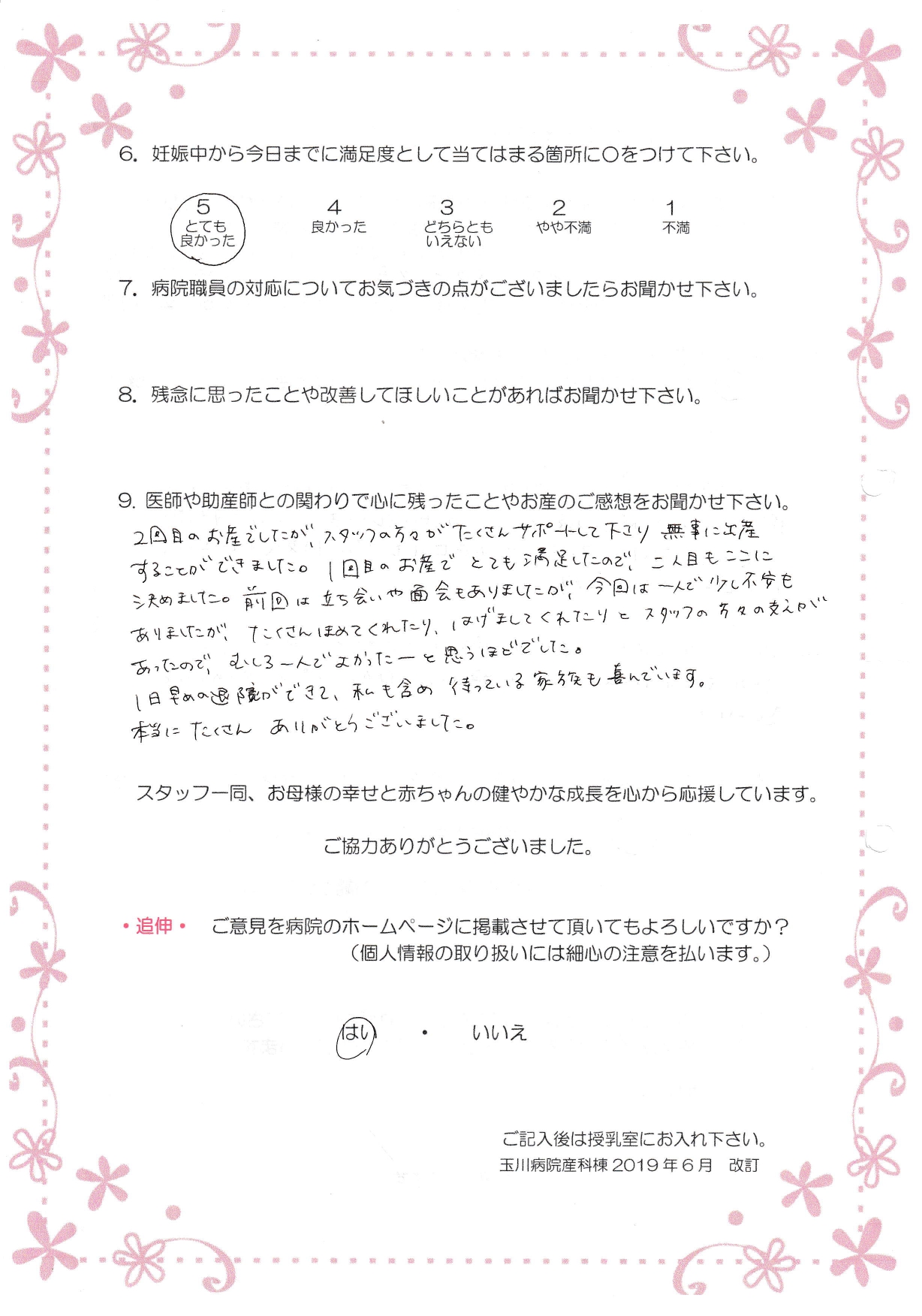 【9】2回目のお産でしたが、スタッフの方々がたくさんサポートして下さり無事に出産することができました。1回目のお産でとても満足でしたので、二人目もここに決めました。前回は立ち会いや面会もありましたが、今回は一人で少し不安もありましたが、たくさんほめてくれたり、はげましてくれたりとスタッフの方々の支えがあったので、むしろ一人でよかったーと思うほどでした。1日早めの退院ができて、私も含め待っている家族も喜んでいます。本当にたくさんありがとうございました。