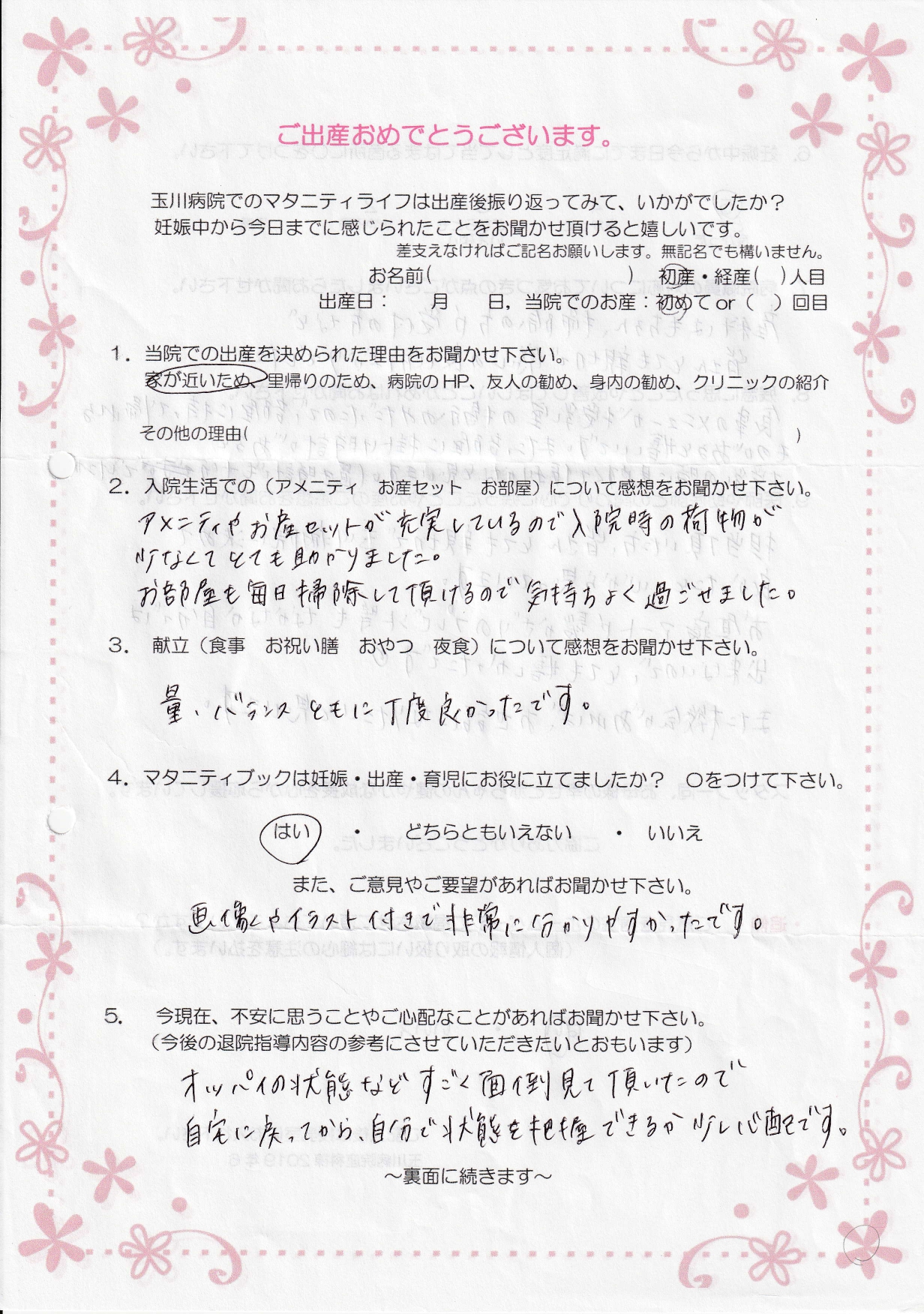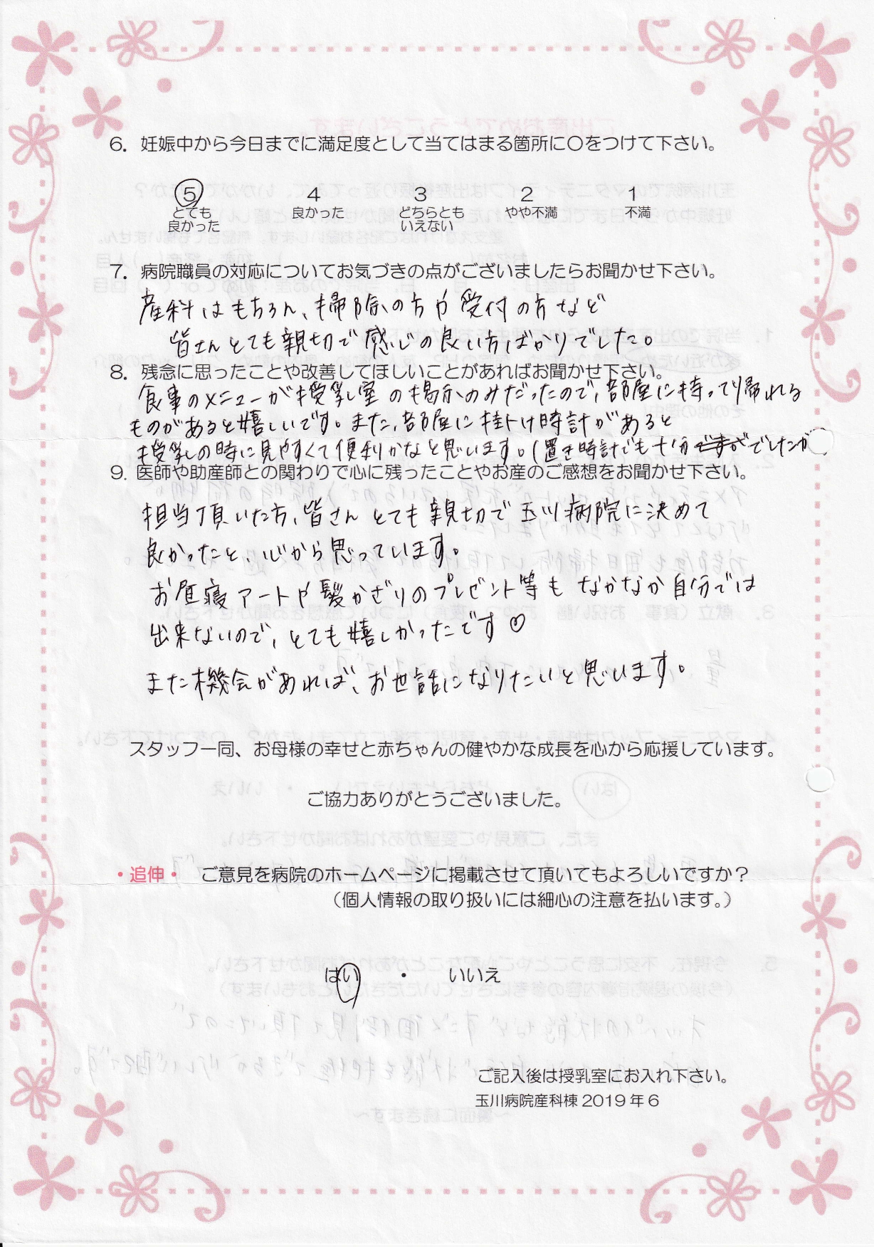 【9】担当頂いた方、皆さんとても親切で玉川病院に決めて良かったと、心から思っています。お昼寝アートや髪かざりのプレゼント等もなかなか自分では出来ないので、とても嬉しかったです♡また機会があれば、お世話になりたいと思います。