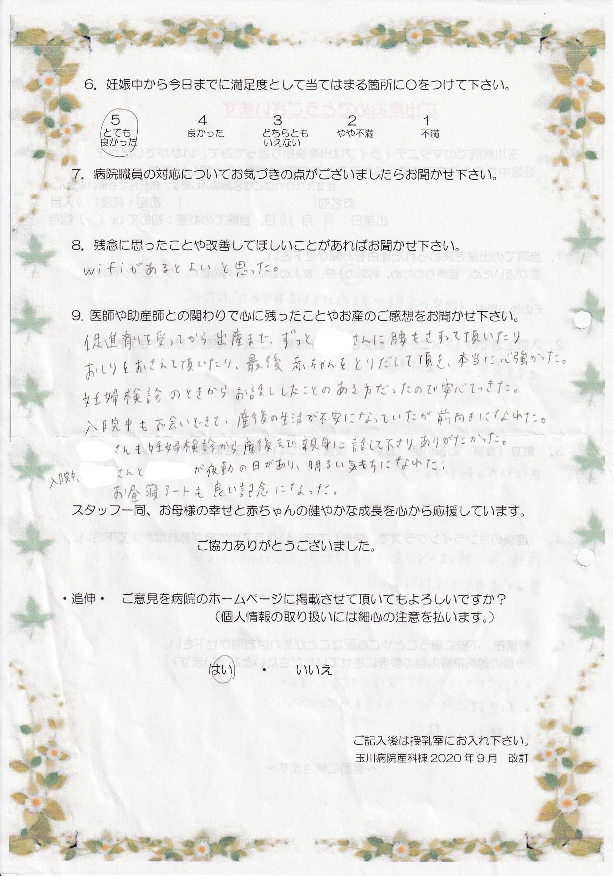 【9】促進剤を受ってから出産まで、ずっと助産師さんに腰をさすって頂いたりおしりをおさえて頂いたり、最後赤ちゃんをとりだして頂き、本当に心強かった。妊婦検診のときからお話したことのある方だったので安心できた。入院中もお会いできて、産後の生活が不安になっていたが前向きになれた。助産師さんも妊婦検診から産後まで親身に話して下さりありがたかった。入院中、2人の助産師さんが夜勤の日があり、明るい気もちになれた!お昼寝アートも良い記念になった。