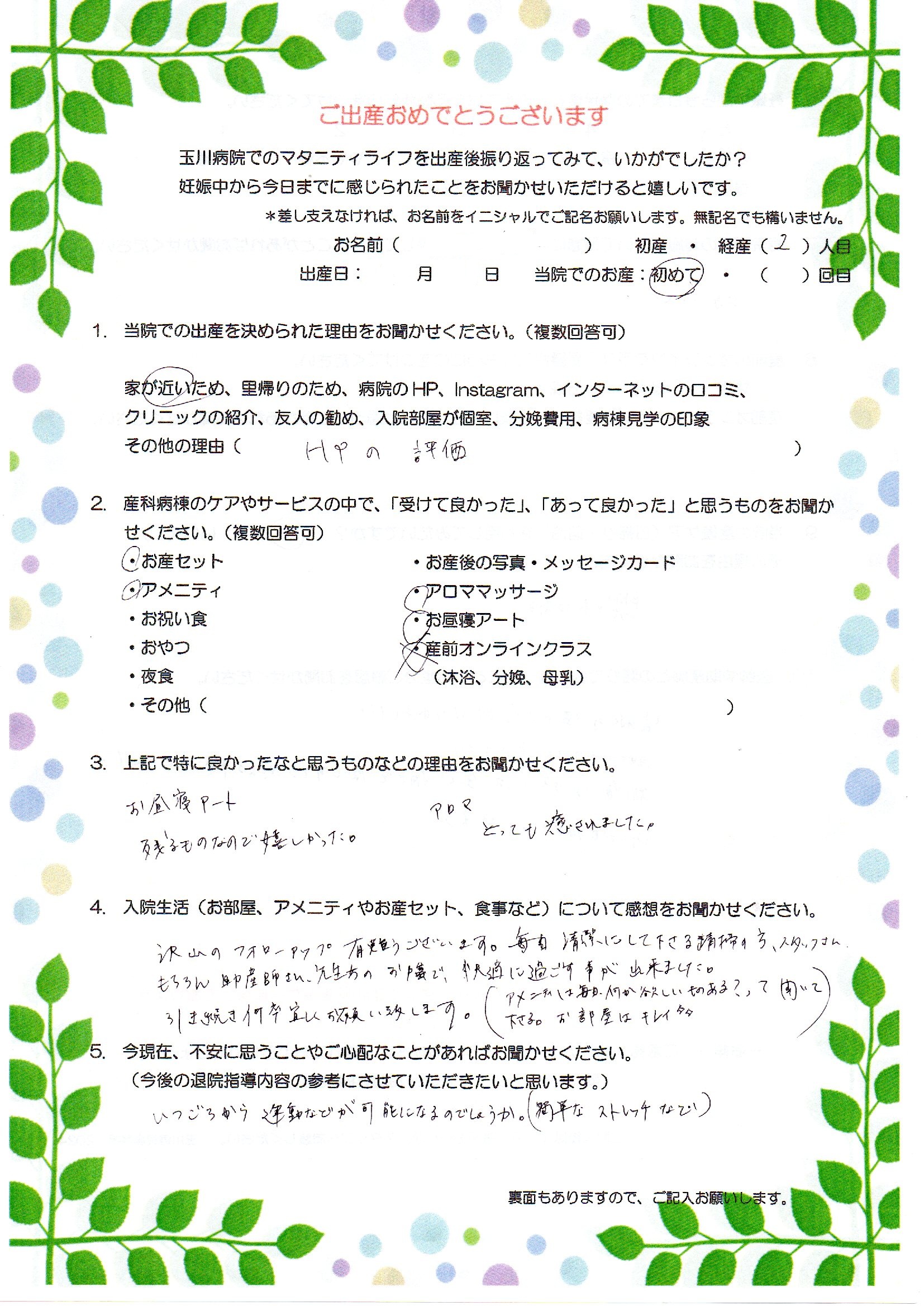 沢山のフォローアップ有難うございます。毎日清潔にして下さる清掃の方、スタッフさんもちろん助産師さん、先生方のお陰で、快適に過ごす事が出来ました。引き続き何卒宜しくお願い致します。(アメニティは毎日何か欲しいものある?って聞いて下さる。お部屋はキレイ✨)
