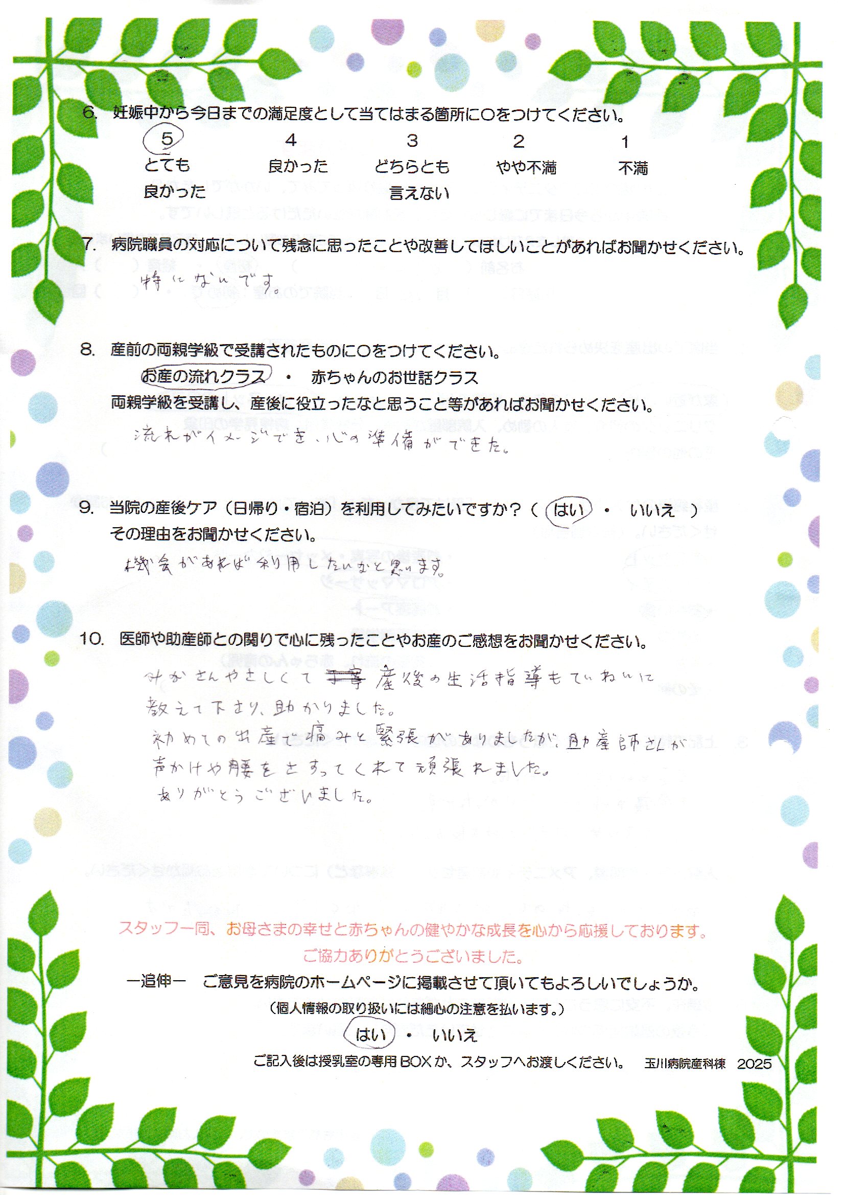 みなさんやさしくて産後の生活指導もていねいに教えて下さり、助かりました。初めての出産で痛みと緊張がありましたが、助産師さんが声かけや腰をさすってくれて頑張れました。ありがとうございました。