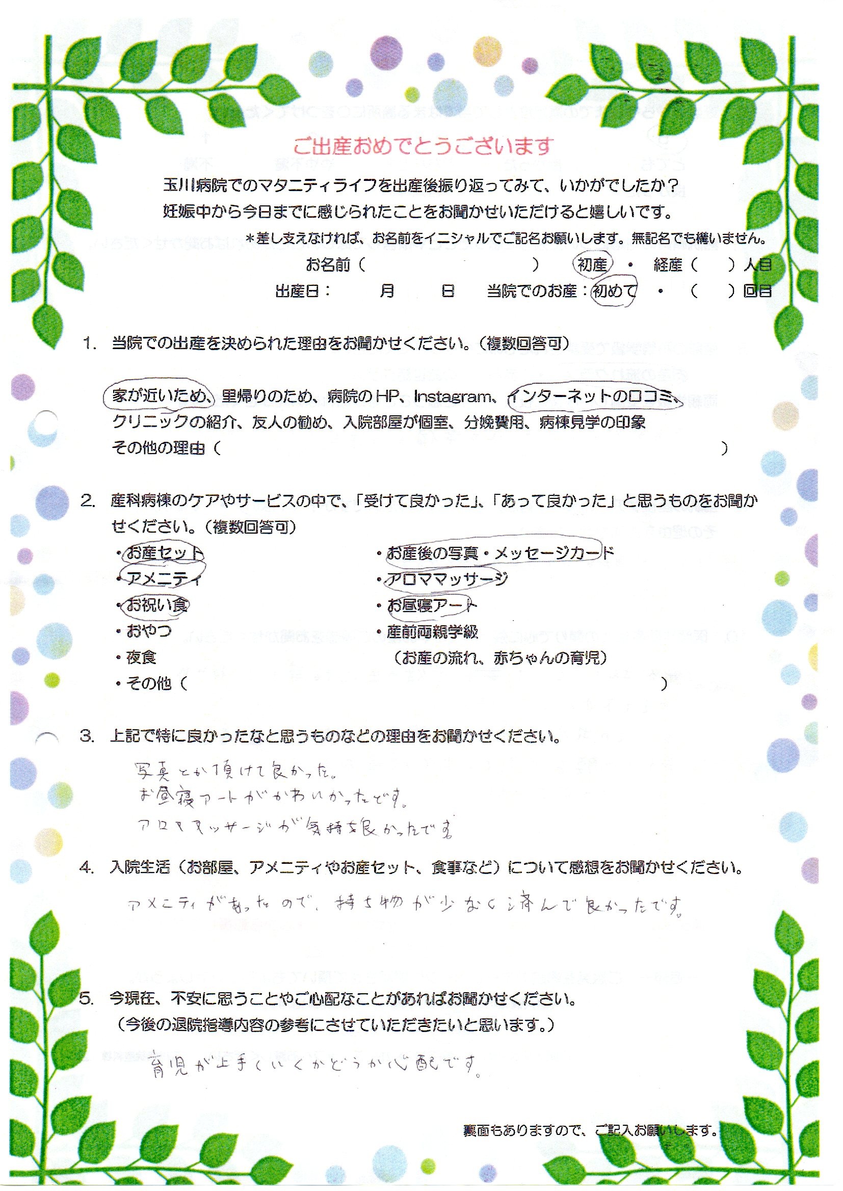 みなさんやさしくて産後の生活指導もていねいに教えて下さり、助かりました。初めての出産で痛みと緊張がありましたが、助産師さんが声かけや腰をさすってくれて頑張れました。ありがとうございました。