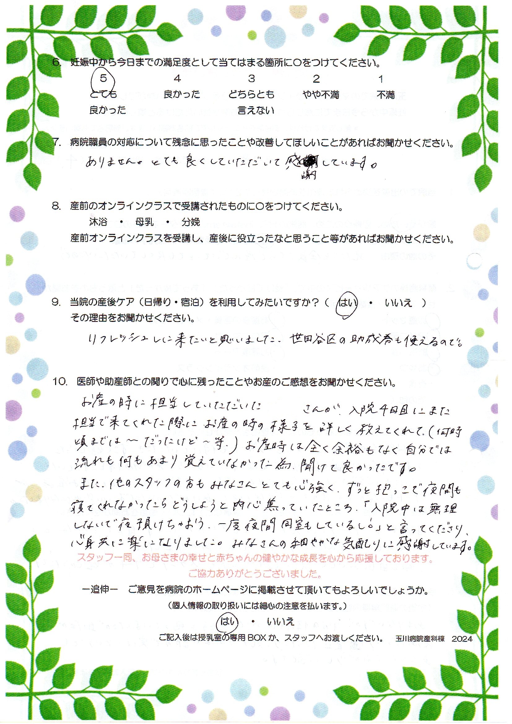 お産の時に担当していただいた○○さんが、入院4日目にまた担当で来てくれた際にお産の時の様子を詳しく教えてくれて(何時頃までは~だったけど~等)お産時は全く余裕もなく自分では流れも何もあまり覚えていなかった為、聞けて良かったです。また、他のスタッフの方もみなさんとても心強く、ずっと抱っこで夜間も寝てくれなかったらどうしようと内心焦っていたところ、「入院中は無理しないで夜預けちゃおう。一度夜間同室もしているし!」と言ってくださり、心身共に楽になりました。みなさんの細やかな気配りに感謝しています。