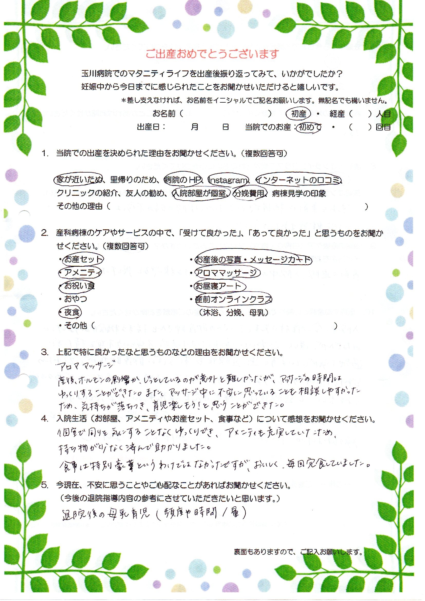 入院中、全ての産科の先生、たくさんの助産師さんと接する機会がありました。みなさんが、優しくていねいに接してくださったので、不安という不安を持たずに過ごせた気がしています。逆に退院後もすぐそばに助産師さんがいてくれたらどれだけ良いだろうという気持ちです。ただ、色々教えていただいたことがあるので、それをもとにして退院後は夫婦で育児を頑張っていこうと思います!お産は正直痛くて辛かったですが、前向きな言葉を常にかけていただけて、頑張れました。たくさんのサポート本当にありがとうございました☺