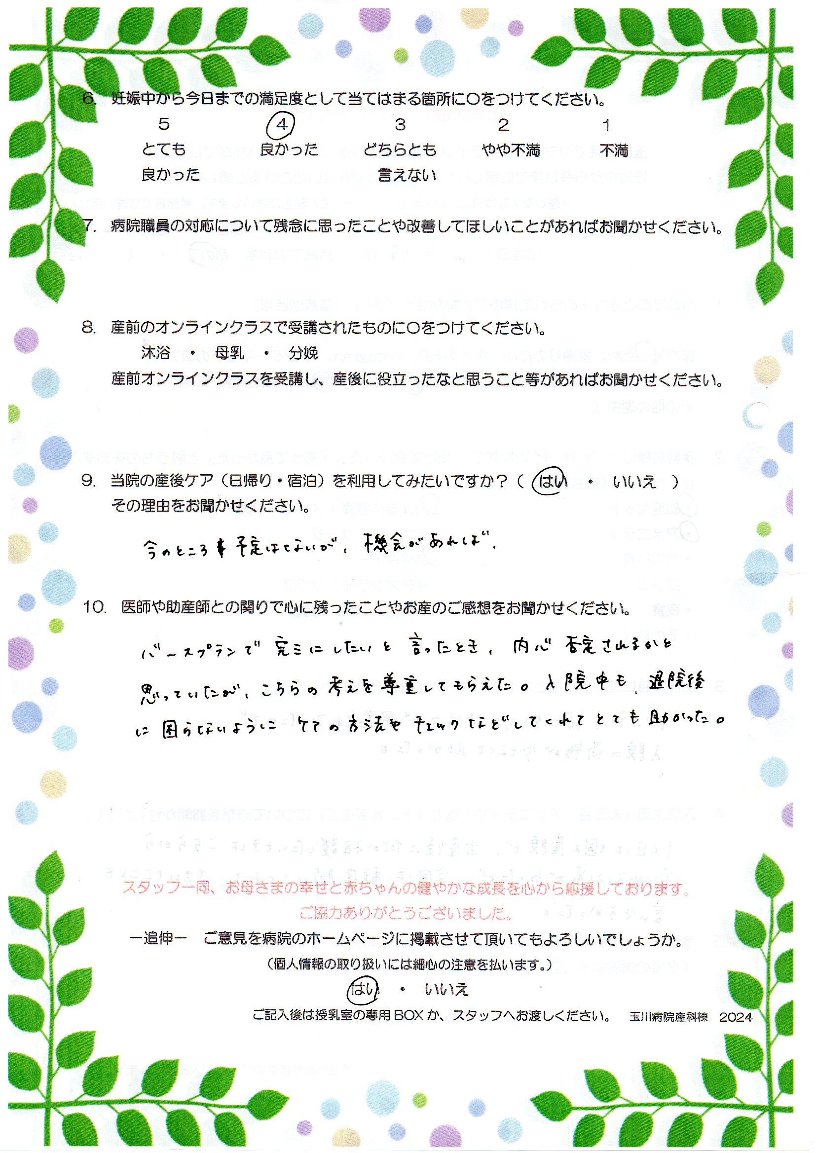 バースプランで完ミにしたいと言ったとき、内心否定されるかと思っていたが、こちらの考えを尊重してもらえた。入院中も、退院後に困らないようにケアの方法やチェックなどしてくれてとても助かった。