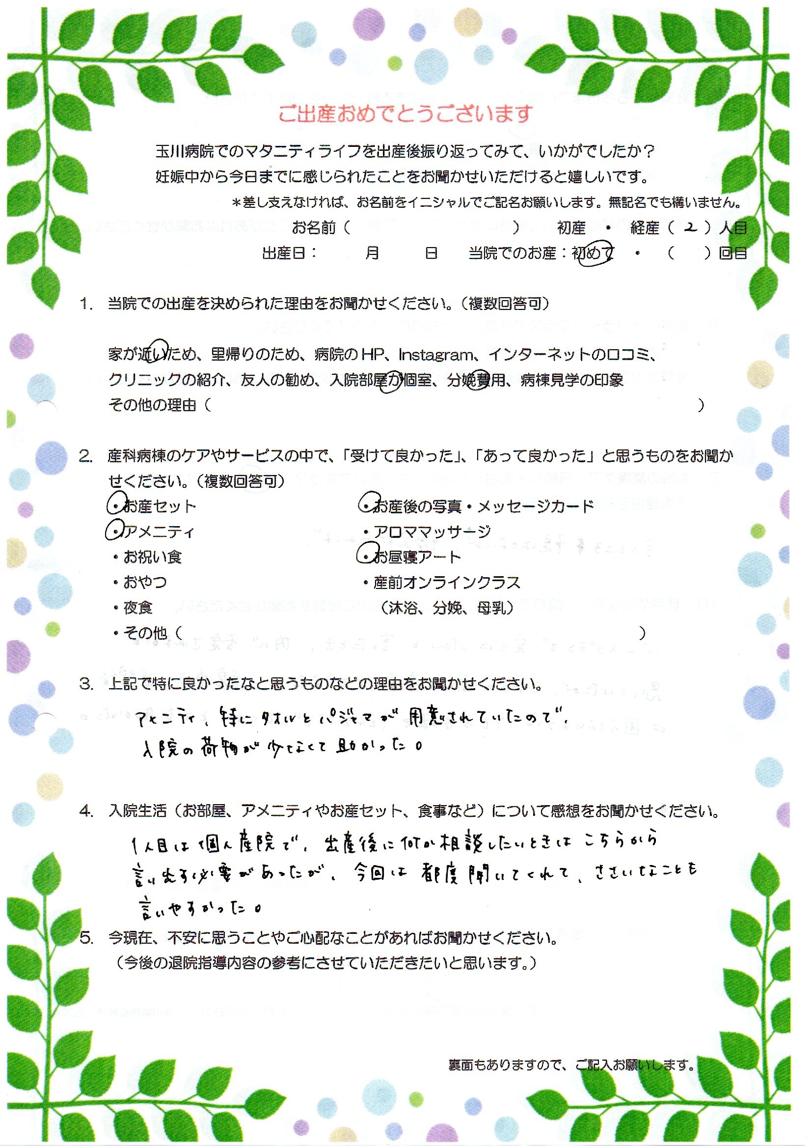 バースプランで完ミにしたいと言ったとき、内心否定されるかと思っていたが、こちらの考えを尊重してもらえた。入院中も、退院後に困らないようにケアの方法やチェックなどしてくれてとても助かった。