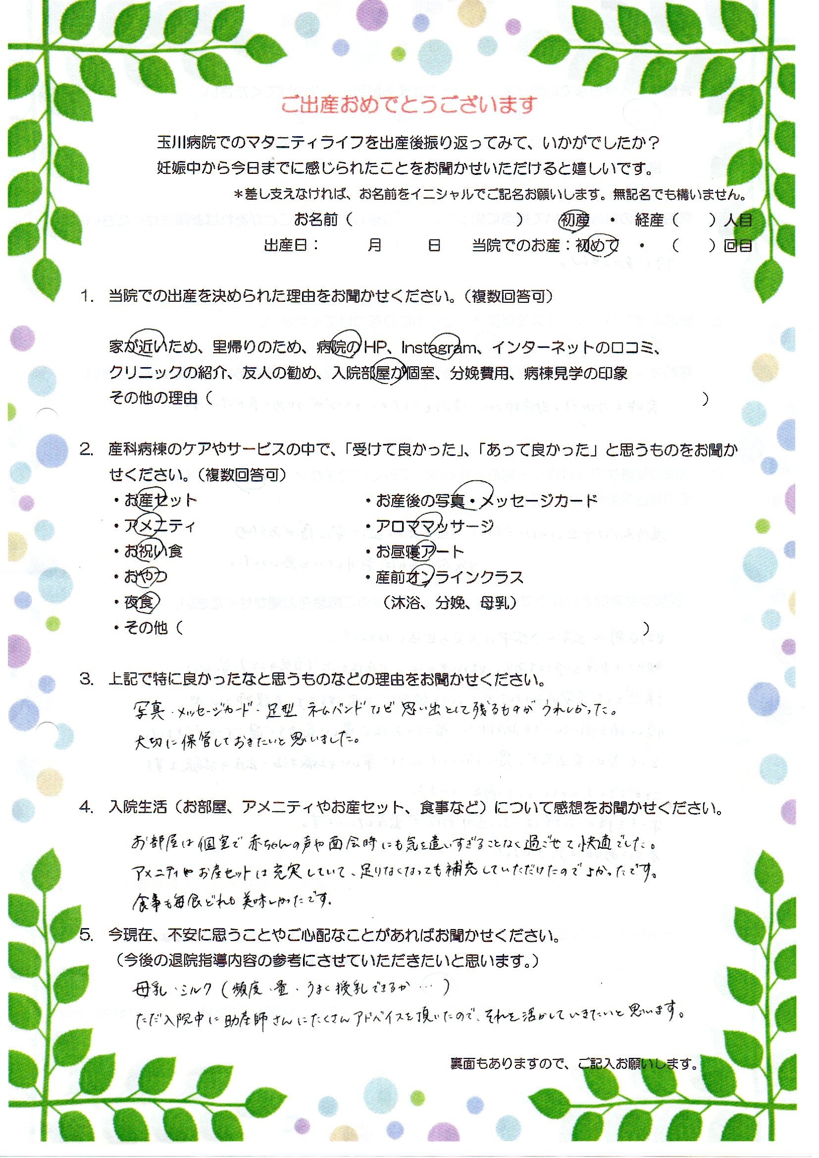 妊娠期~出産~入院中は大変お世話になりました。初めてのお産ということもあり、妊娠中のこと、出産後のこと(育児のこと)最初は漠然とした不安がありましたが、いつも診察でお会いする先生、看護師さんや優しく話を聞いてくださる助産師さん皆さまのお陰で楽しい気持ちで過ごすことができました。とても温かい雰囲気で、思い描いていた以上に楽しい妊娠生活・出産の経験をすることができ、夫とともにとても満足しています。第二子を授かった際は、また玉川病院で出産したいです。本当にありがとうございました!