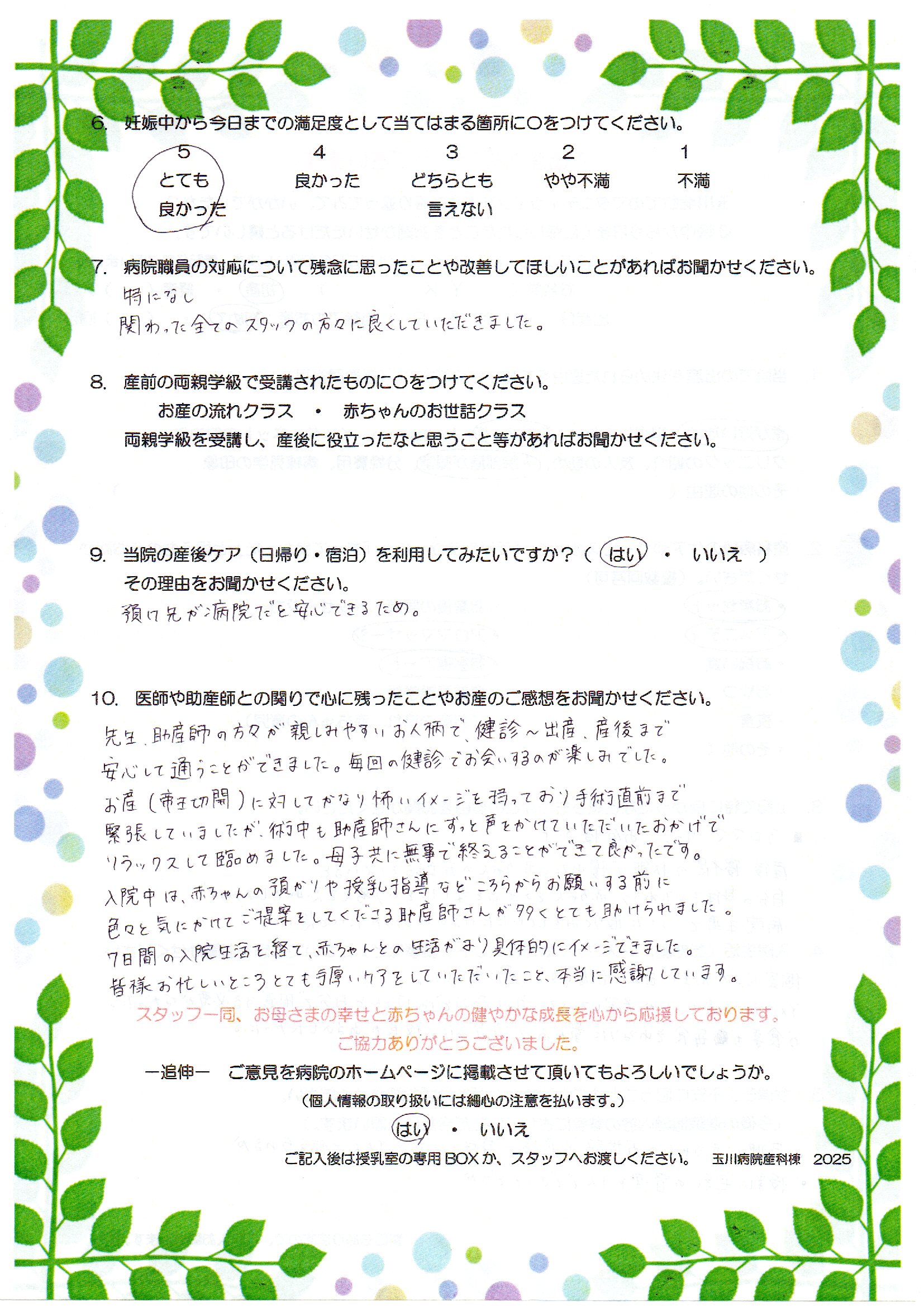 先生、助産師の方々が親しみやすいお人柄で、健診~出産、産後まで安心して通うことができました。毎回の健診でお会いするのが楽しみでした。お産(帝王切開)に対してかなり怖いイメージを持っており手術直前まで緊張していましたが、術中も助産師さんにずっと声をかけていただいたおかげでリラックスして臨めました。母子共に無事で終えることができて良かったです。入院中は、赤ちゃんの預かりや授乳指導などこちらからお願いする前に色々と気にかけてご提案してくださる助産師さんが多くとても助けられました。7日間の入院生活を経て、赤ちゃんとの生活がより具体的にイメージできました。皆様お忙しいところとても手厚いケアをしていただいたこと、本当に感謝しています。