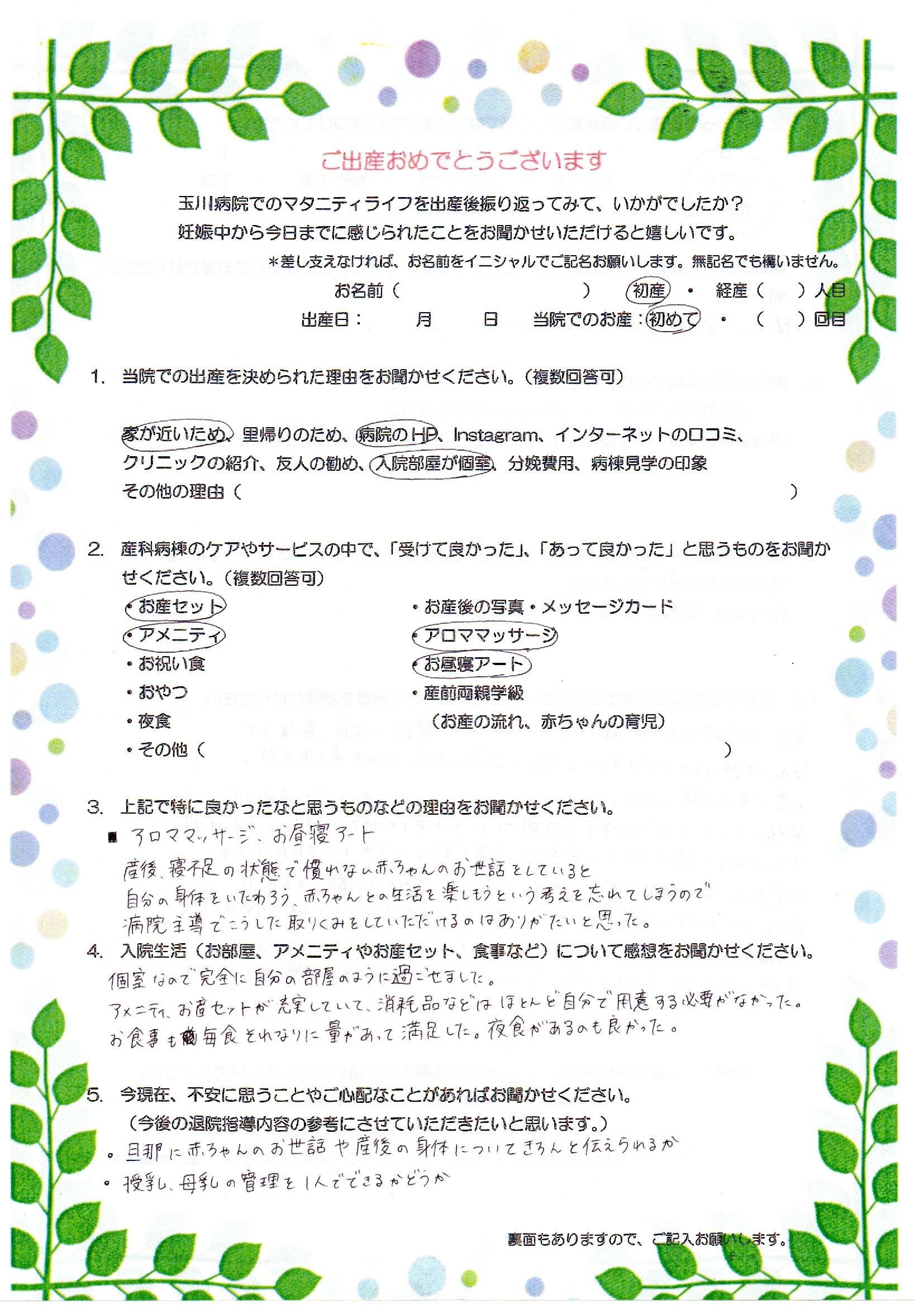 先生、助産師の方々が親しみやすいお人柄で、健診~出産、産後まで安心して通うことができました。毎回の健診でお会いするのが楽しみでした。お産(帝王切開)に対してかなり怖いイメージを持っており手術直前まで緊張していましたが、術中も助産師さんにずっと声をかけていただいたおかげでリラックスして臨めました。母子共に無事で終えることができて良かったです。入院中は、赤ちゃんの預かりや授乳指導などこちらからお願いする前に色々と気にかけてご提案してくださる助産師さんが多くとても助けられました。7日間の入院生活を経て、赤ちゃんとの生活がより具体的にイメージできました。皆様お忙しいところとても手厚いケアをしていただいたこと、本当に感謝しています。