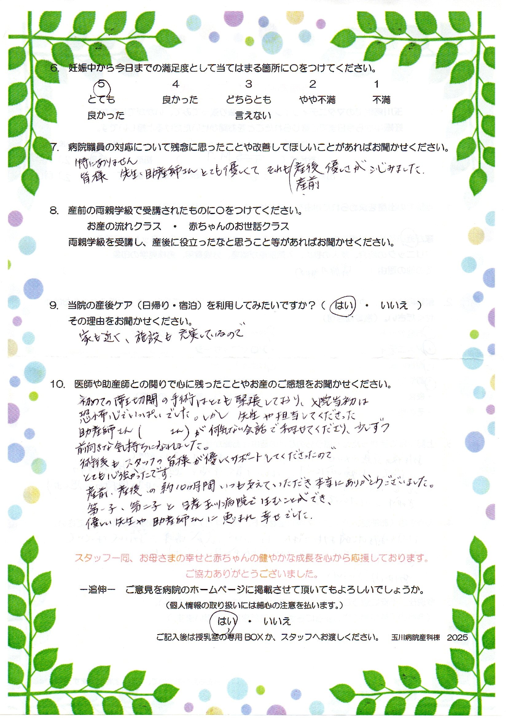 初めての帝王切開の手術はとても緊張しており、入院当初は恐怖心でいっぱいでした。しかし先生や担当してくださった助産師さん(○○さん)が何気ない会話で和ませてくださり、少しずつ前向きな気持ちになれました。術後もスタッフの皆様が優しくサポートしてくださったのでとても心強かったです。産前・産後の約10ヶ月間いつも支えていただき本当にありがとうございました。第一子・第二子と日産玉川病院で生むことができ、優しい先生や助産師さんに恵まれ幸せでした。