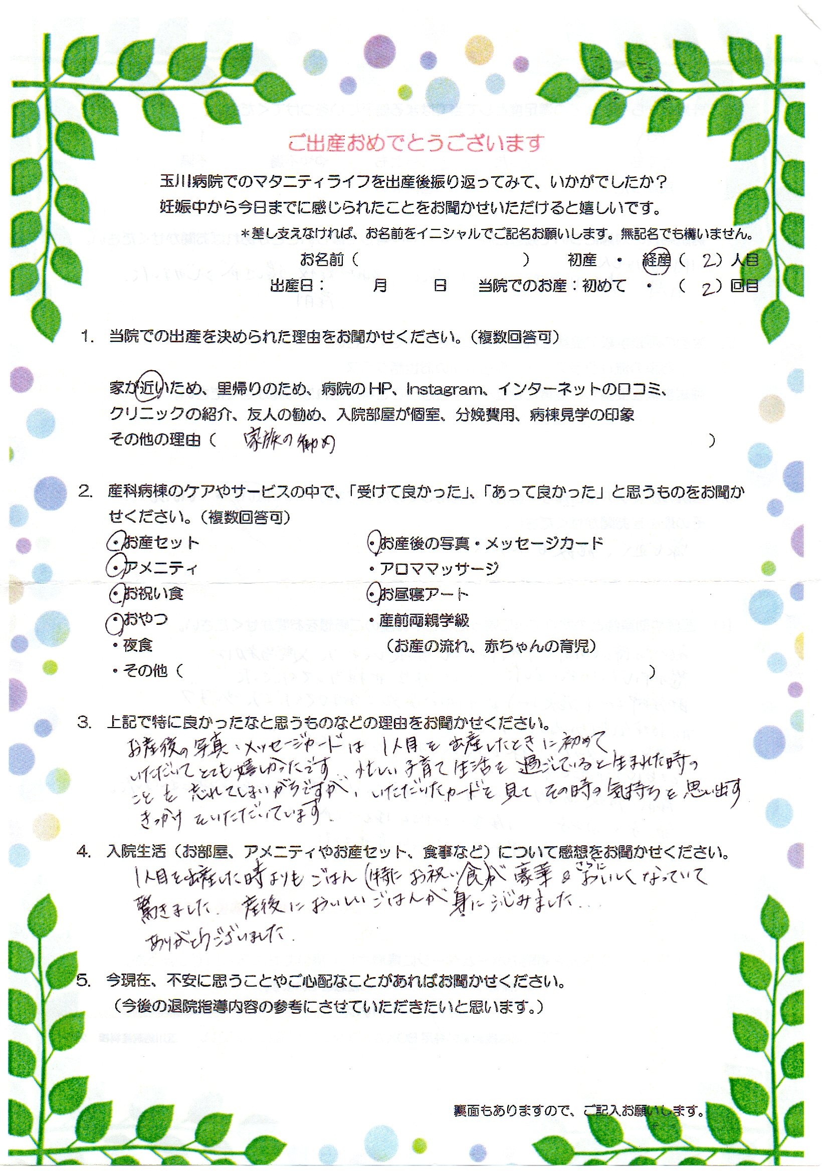 初めての帝王切開の手術はとても緊張しており、入院当初は恐怖心でいっぱいでした。しかし先生や担当してくださった助産師さん(○○さん)が何気ない会話で和ませてくださり、少しずつ前向きな気持ちになれました。術後もスタッフの皆様が優しくサポートしてくださったのでとても心強かったです。産前・産後の約10ヶ月間いつも支えていただき本当にありがとうございました。第一子・第二子と日産玉川病院で生むことができ、優しい先生や助産師さんに恵まれ幸せでした。