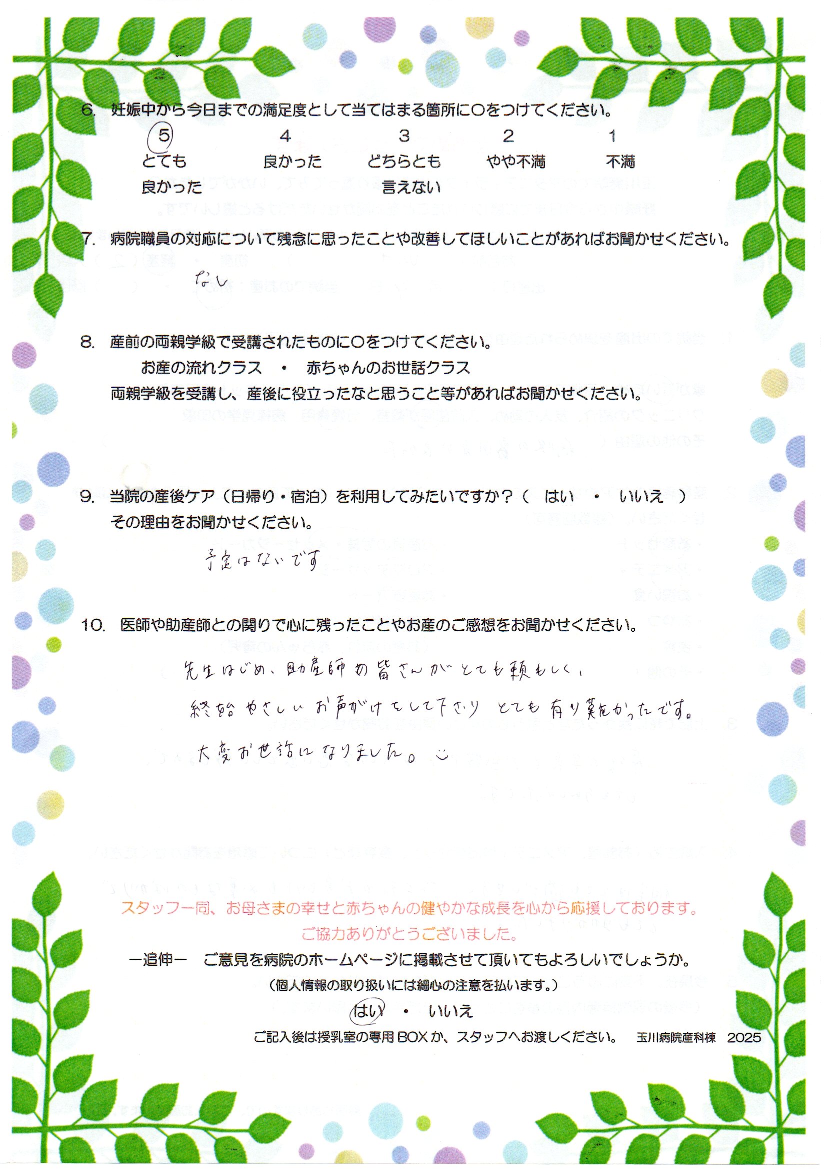 先生はじめ、助産師の皆さんがとても頼もしく、終始やさしいお声がけをして下さりとても有り難かったです。大変お世話になりました。☺
