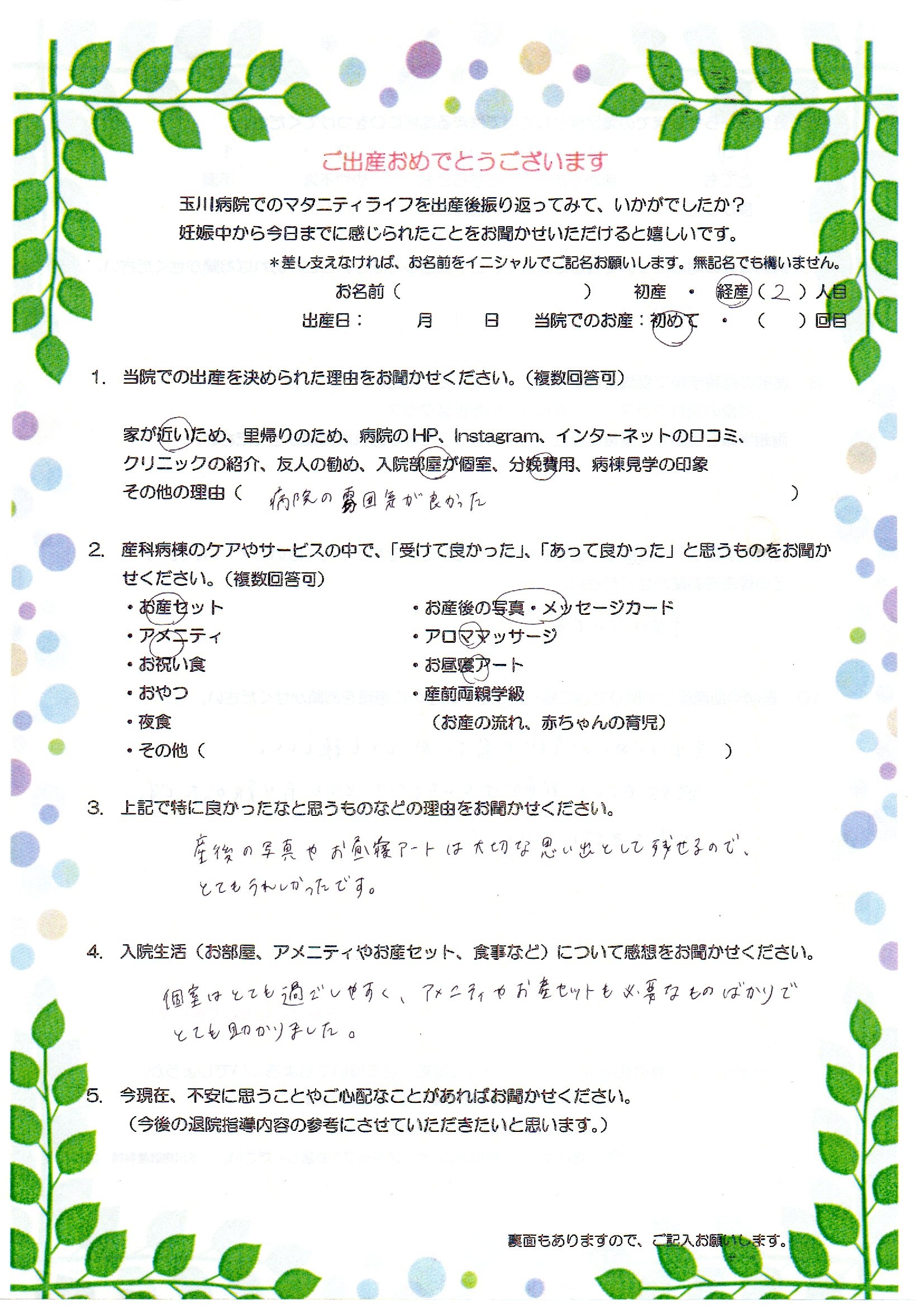 先生はじめ、助産師の皆さんがとても頼もしく、終始やさしいお声がけをして下さりとても有り難かったです。大変お世話になりました。☺