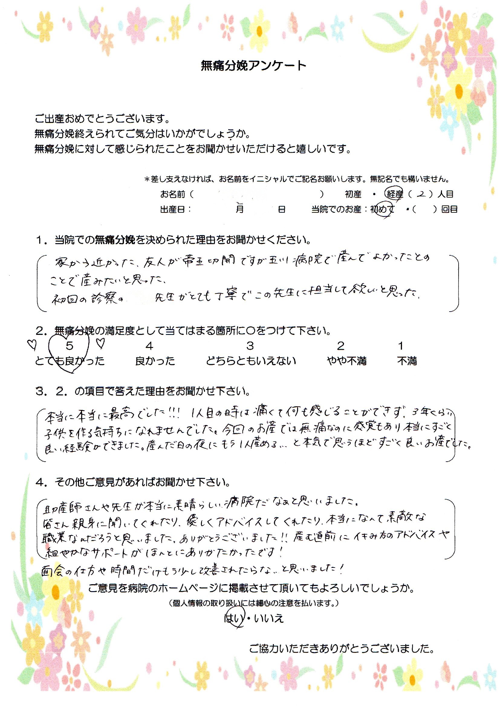 1.当院での無痛分娩を決められた理由をお聞かせください。