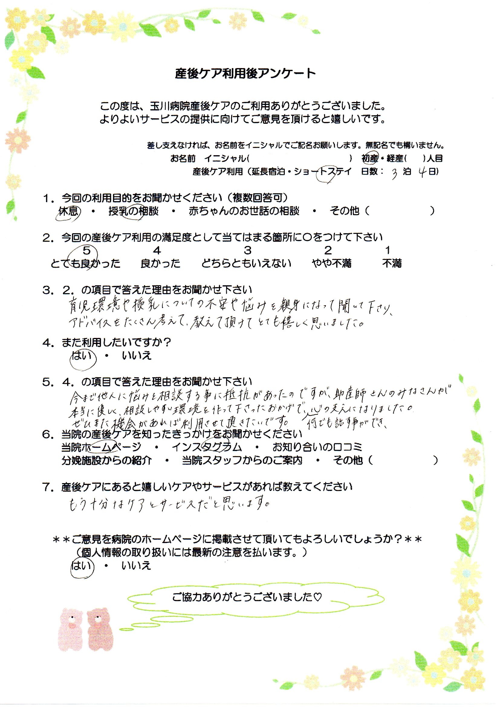今まで他人に悩みを相談する事に抵抗があったのですが、助産師さんのみなさんが本当に優しく、相談しやすい環境を作って下さったおかげで、何でも話す事ができ、心の支えになりました。ぜひまた機会があれば利用させて頂きたいです。